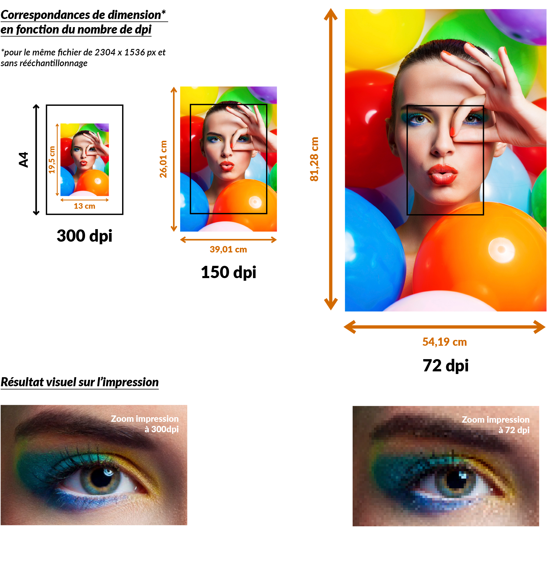 Plus la valeur en dpi de votre image est élevée, plus il y aura de pixels dans une surface correspondant à 2,54 x 2,54 cm et ainsi plus votre tirage sera détaillé, mais moins l’image sera grande. Si vous souhaitez réaliser des grands formats, il sera peut-être nécessaire de réduire votre résolution, pour augmenter sa capacité de taille d’impression, mais vous perdrez en détails.