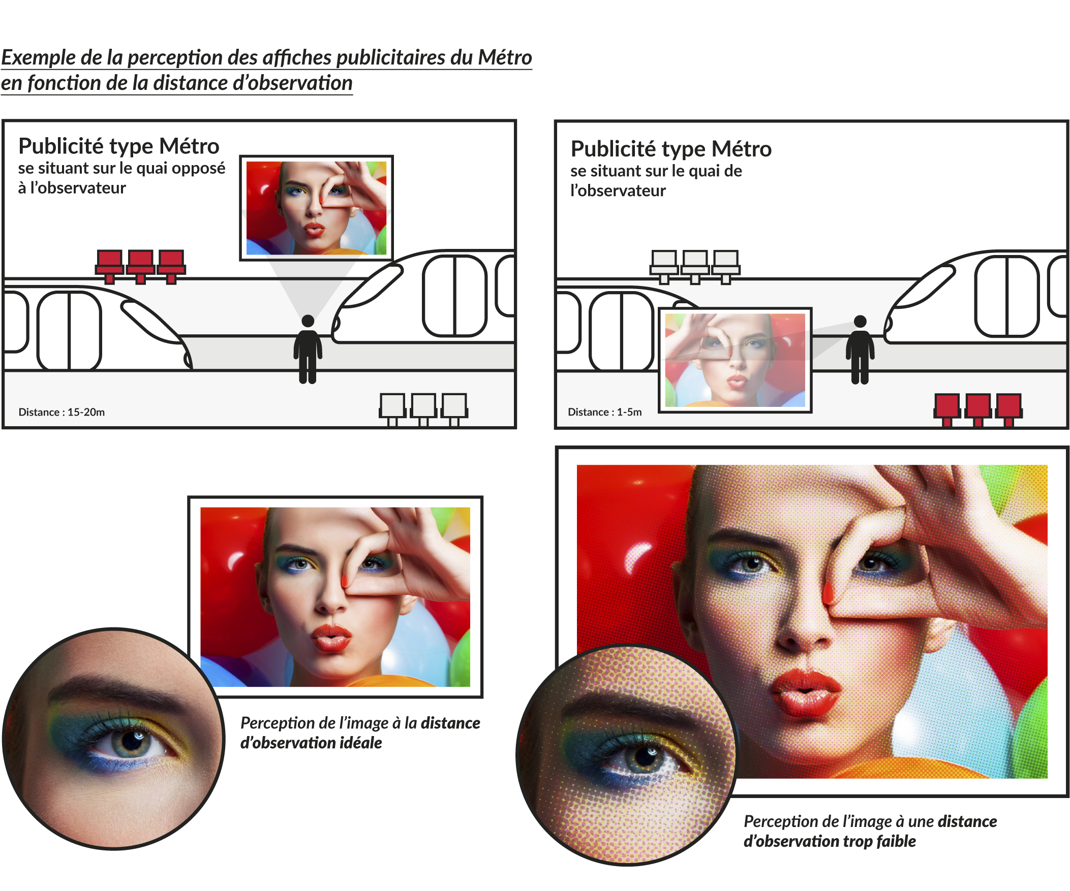 Pour que votre œil ne discerne plus les points d’encre rapprochés d’une impression et que l’image ne soit pas perçue comme pixellisée ou floue, on estime qu’il faut que la distance d’observation soit au minimum de 25cm pour un fichier initial d’une résolution de 300dpi.