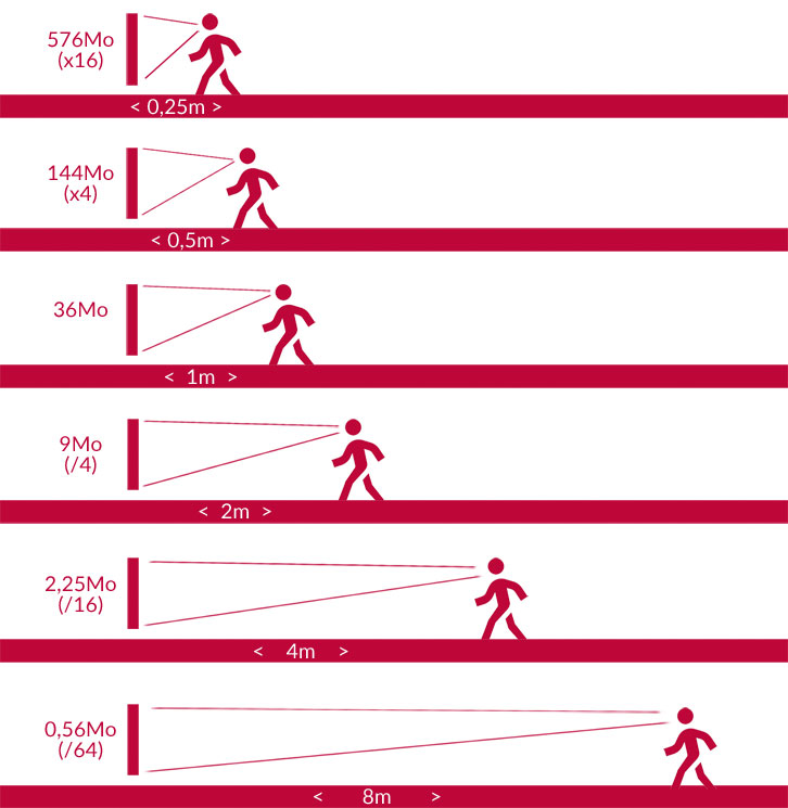 La résolution nécessaire et suffisante (ou ‘optimale’) est destinée aux tirages qui sont observés de loin. En effet, plus une image* nécessite du recul, plus sa résolution pourra être réduite. Elle sera divisée par deux à chaque fois que l’on double la distance de visualisation.