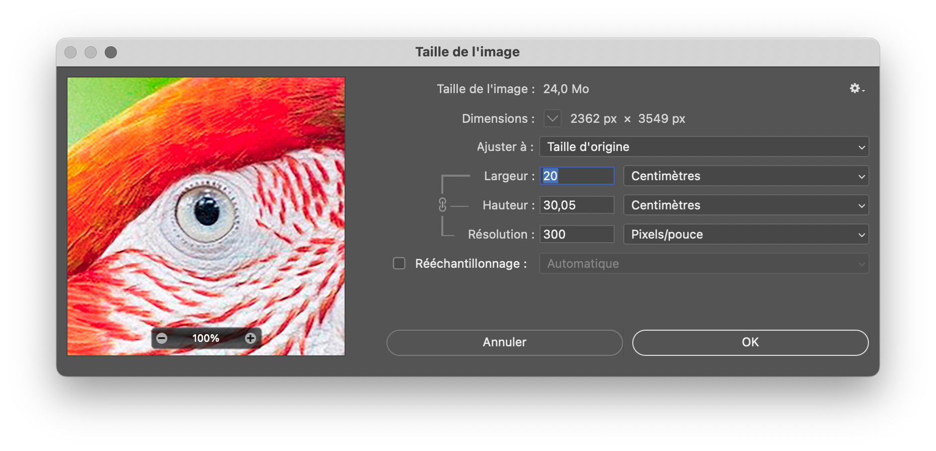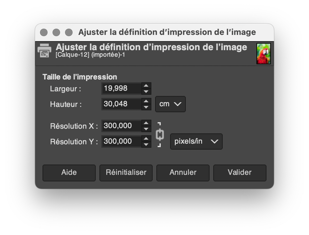 Si vous souhaitez modifier la résolution ou la taille d’impression de votre fichier, sans interpolation (ou rééchantillonnage), vous devrez vous rendre dans les menus dédiés des applications de traitement de l’image.
