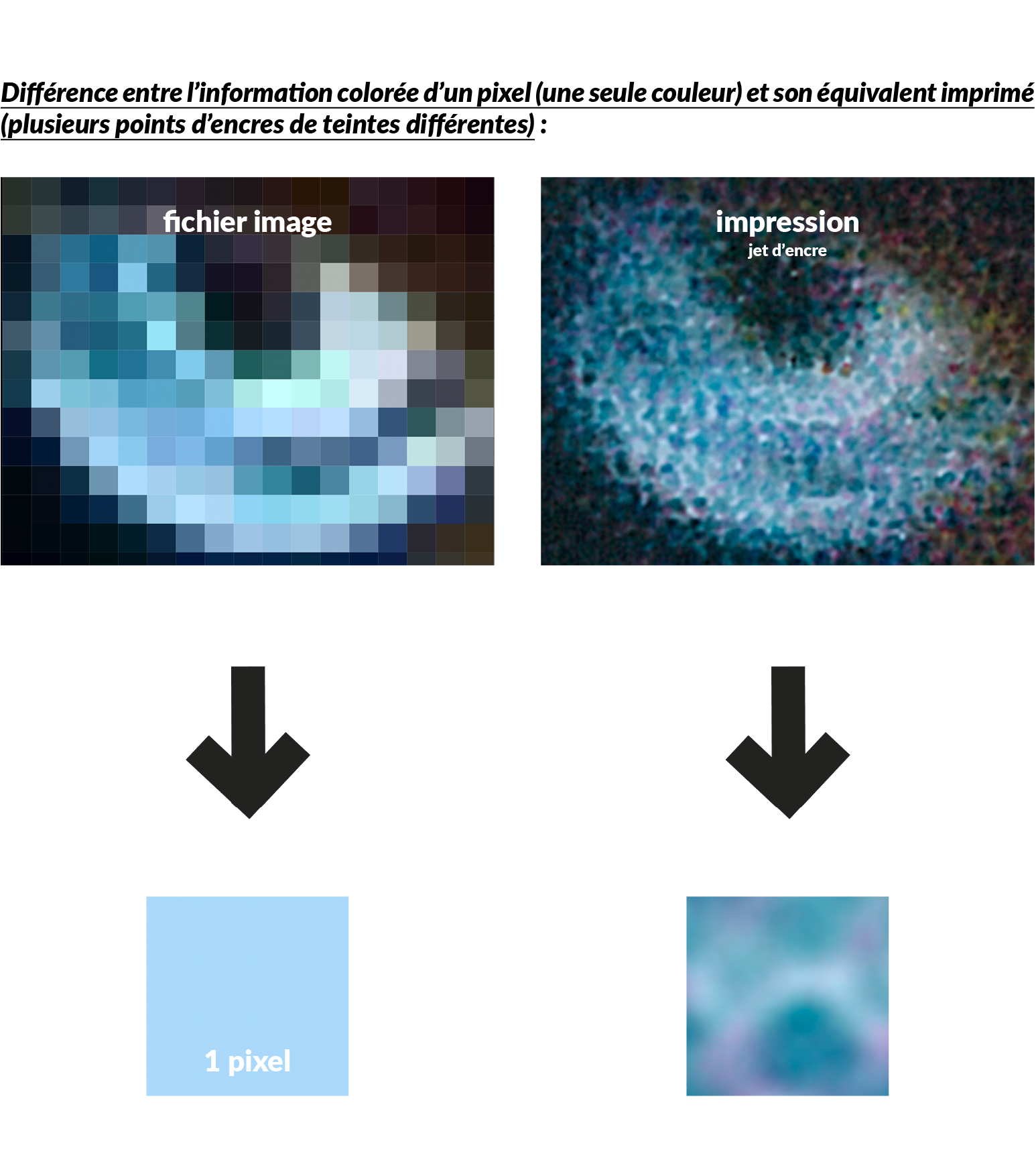 Dans le système d’impression pour transcrire les pixels de votre fichier image en gouttes sur le papier (ou autre support).