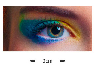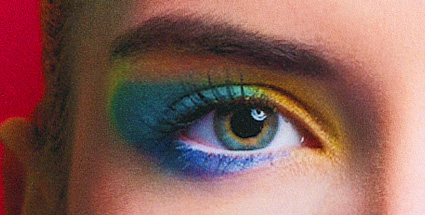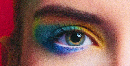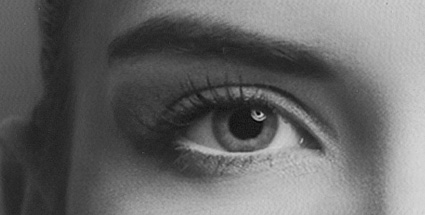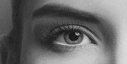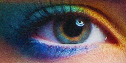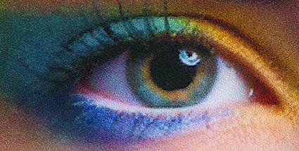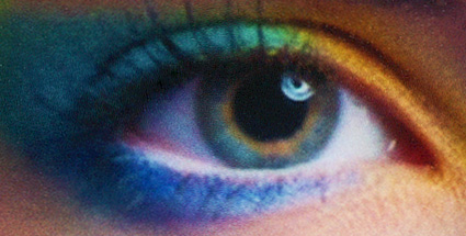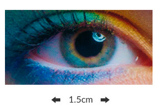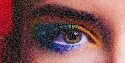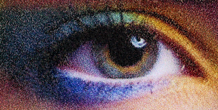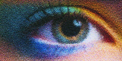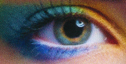 Nous en avons extrait un même détail, l'oeil à gauche du visage, pour mettre en évidence le rendu de la trame pour chaque procédé d’impression : ce détail correspond à 3 cm de long et à 1.5 cm de long sur le tirage 12x12cm.
