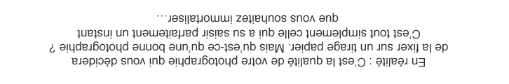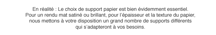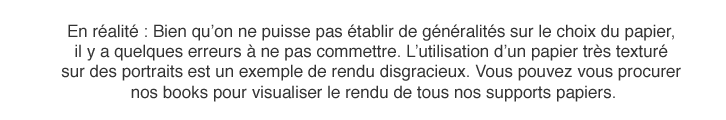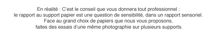 Il sera également complètement inutile de faire des essais d’une seule photographie sur différents papiers pour guider votre choix, vous risqueriez de prendre une décision efficace quant au rendu que vous désirez obtenir. Vous n’êtes pas de ceux qui souhaitent tout maîtriser n’est ce pas ? Ne perdez pas non plus votre temps à acheter l’un des books qui vous permettront de vous projeter sur toute notre gamme de papier, et qui vous serviront durant de longues années.