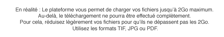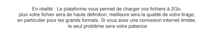 Comme vous n’avez aucun logiciel de traitement d’image et que vous n’avez que vos fichiers RAW très volumineux sur vos cartes mémoire d’appareil photo qui regorgent de million de pixels, envoyez les directement sur notre interface de téléchargement. Vous serez presque sûrs de dépasser les 2Go! Ainsi le fichier ne sera pas pris en charge par notre plateforme : succès garanti de ne pas avoir du tout de tirage !