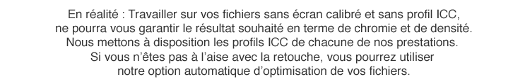 Comme le jeu du hasard, on garde la surprise du résultat des couleurs au tirage. Avec un peu de chance, pendant le transfert, la densité et la chromie du fichier seront parfaitement adaptées, et vous aurez des couleurs éclatantes qui feront des jaloux parmi les plus férus utilisateurs de cibachrome. Pour cela, ne prenez pas la peine de vérifier le rendu de vos écrans grâce à une technique simple et rapide détaillée ici. Inutile également de télécharger tous les profils ICC mis à disposition gratuitement pour chacun de nos produits et prestations !