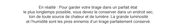 Enfin, une fois que vous aurez le pire tirage au monde entre les mains, vous pourrez en user à votre guise. On vous conseille particulièrement de l’exposer en plein soleil, face à une fenêtre, dans une pièce avec d’importants changements de température et un fort taux d’humidité. Vous aurez le plaisir de voir évoluer votre tirage au fil du temps. Chaque jour vous pourrez évaluer ses changements de couleur et de densité, lui offrant ainsi plusieurs vies !