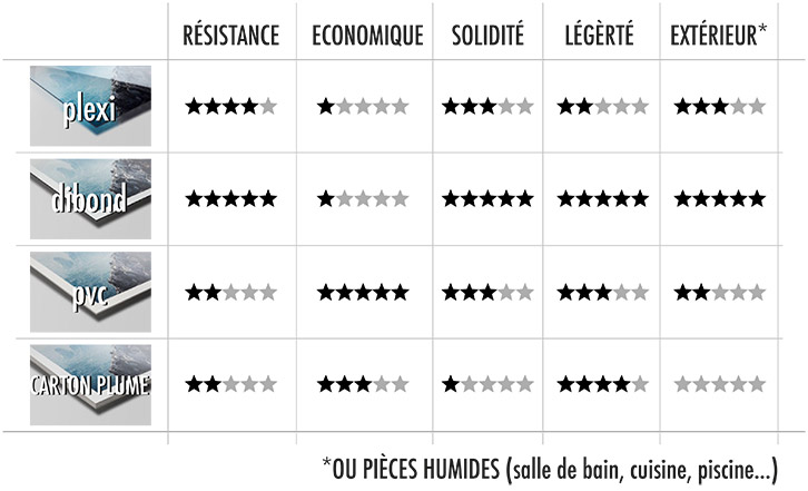 Vous aurez le choix parmi quatre supports entre le Dibond (blanc ou alu brossé), le Plexiglas, le PVC ou le carton plume. Votre sélection pourra être motivée par des problématiques techniques telles que le mode d’accrochage, cependant le dibond restera le support le plus adapté à une exposition en extérieur.