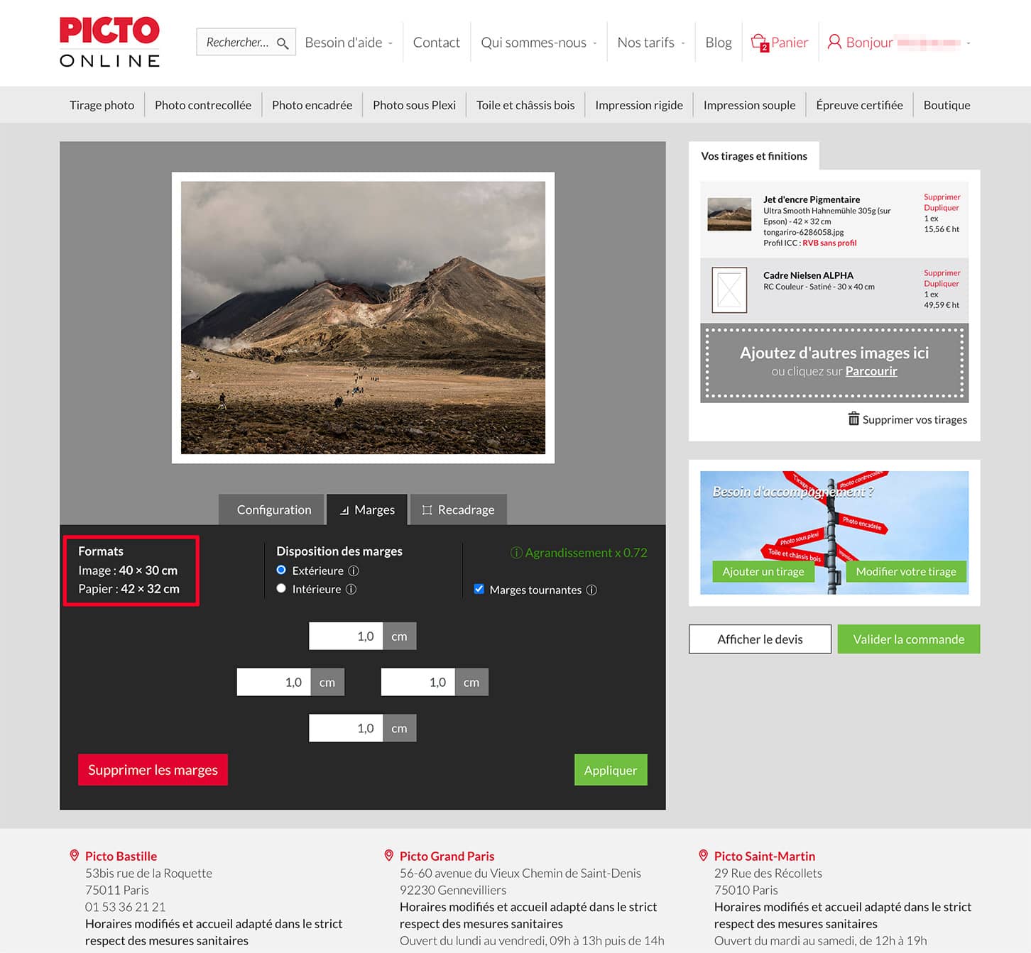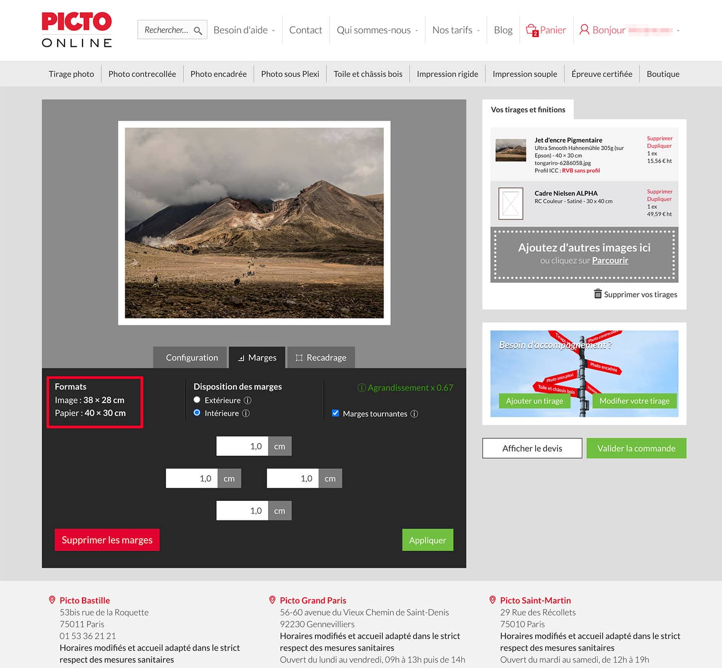 Afin de bien maîtriser le rendu final de votre tirage, avec vos marges, il est important de vous référer aux deux formats spécifiés dans l’onglet marges qui vous donne la taille de l’image et la taille du tirage papier, afin d’éviter toute mauvaise surprise.