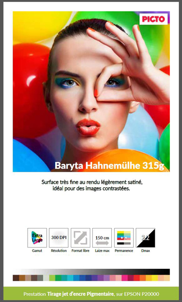 Pour chaque échantillon, d’un format 13x22 cm, un visuel haute définition vous permet de vous rendre compte du rendu du support. Vous trouverez également toutes les informations techniques indispensables : gamut du papier, résolution d’impression, format, laize maximale, permanence et Dmax.