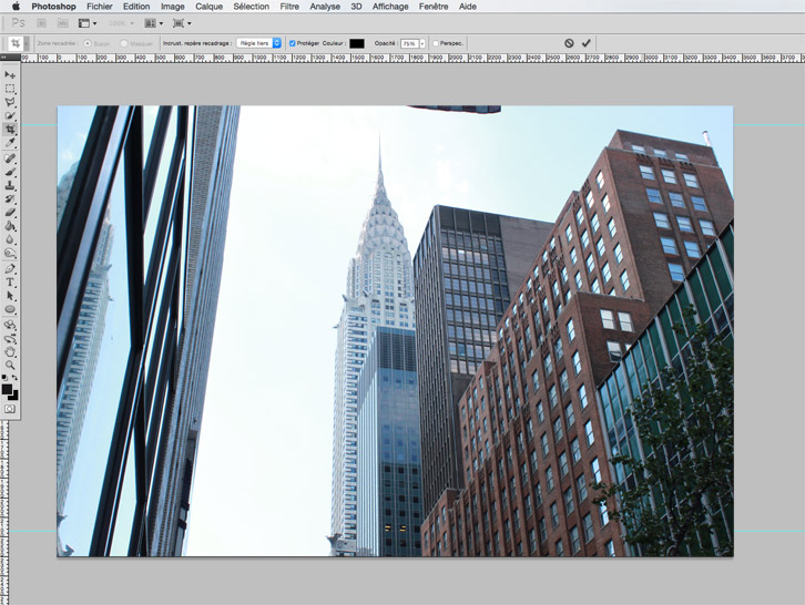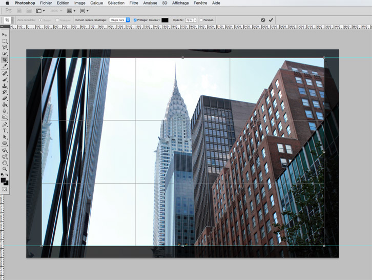 A l’ouverture de votre fichier, vous pouvez utiliser des repères pour vous rendre compte du recadrage final. Depuis votre barre d’outils, sélectionnez l’outil [Recadrage]. Tracez une nouvelle zone de recadrage en faisant glisser les angles et les poignées de contour pour délimiter le nouveau cadre de votre image. Le logiciel ajoute un fond plus sombre sur la zone à supprimer, une fois que vous jugerez le recadrage satisfaisant, appuyez sur la touche [entrée] pour valider le recadrage. Si besoin, vous pouvez revenir sur votre action en vous rendant dans votre historique, ou avec un simple retour [Ctrl+Z ou Pomme +Z]