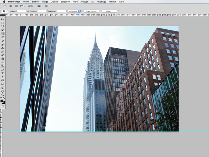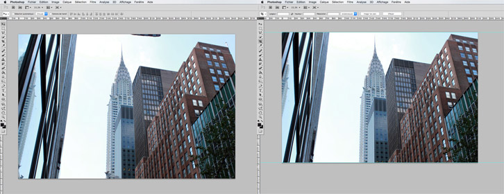 Si vous souhaitez réaliser un recadrage homothétique, c’est à dire garder le même ratio que le format originel, utiliser l’outil de recadrage en sélectionnant la totalité de votre image, placez successivement le curseur sur chacun des quatre coins de l’image en appuyant sur la touche [shift] de votre clavier, le recadrage se fera dans les diagonales. Si vous souhaitez opérer facilement un recadrage carré, vous devez simplement cliquez sur la touche [shift] avant d’utiliser l’outil de recadrage. La fenêtre de cadre sera automatiquement carré.