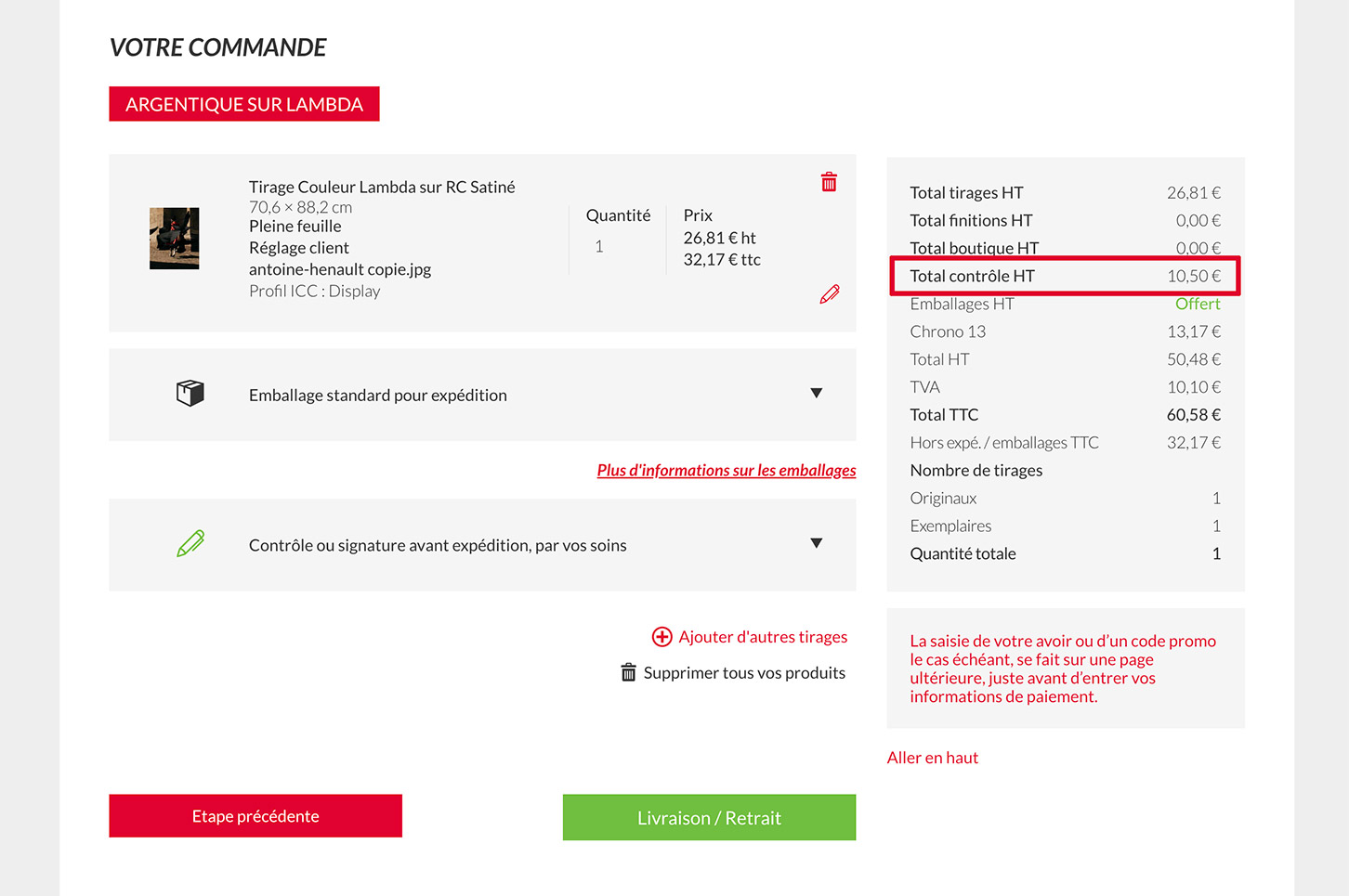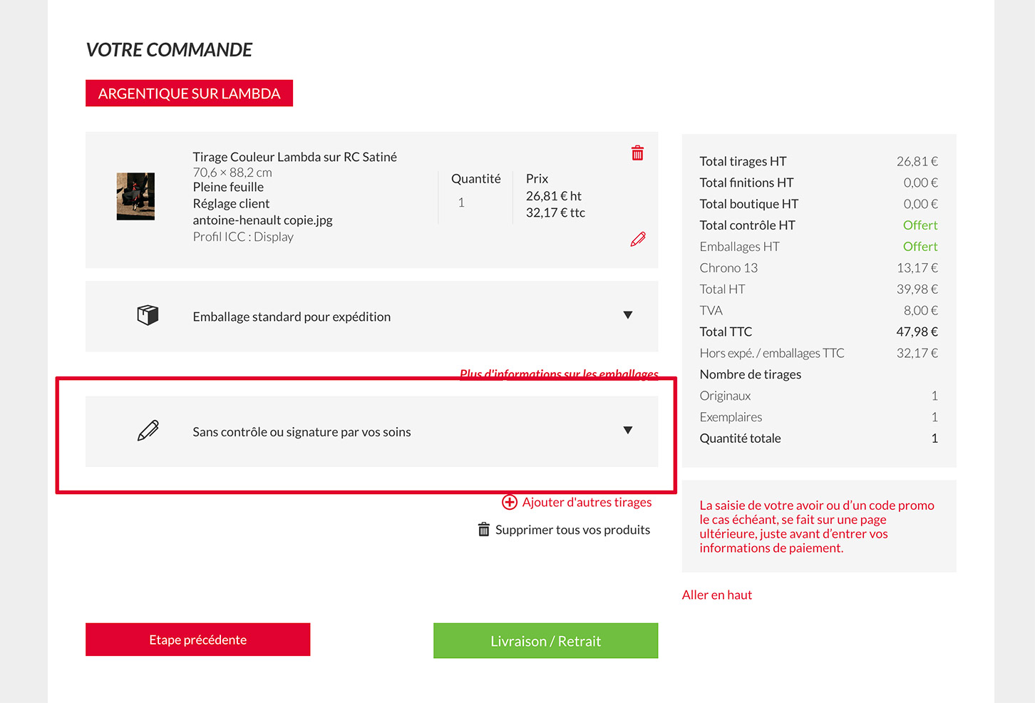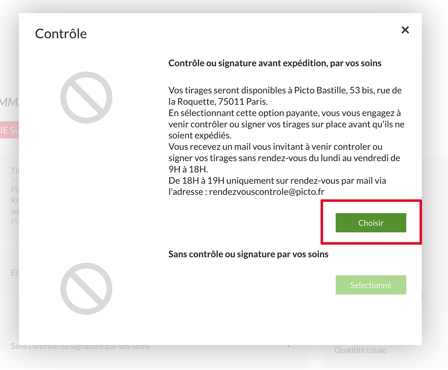 Lors du passage de votre commande, sur le récapitulatif de vos achats, vous accéderez à notre option “Contrôle ou signature par vos soins”. Par défaut, cette option est désactivée.