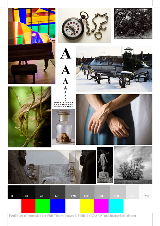 “J’ai testé de nombreux de papiers qui m’intéressaient à l’aide d’une image A4 que j’ai composée avec diverses photos et des patches colorés, ce qui me permet de voir le rendu des couleurs sur chaque support.”