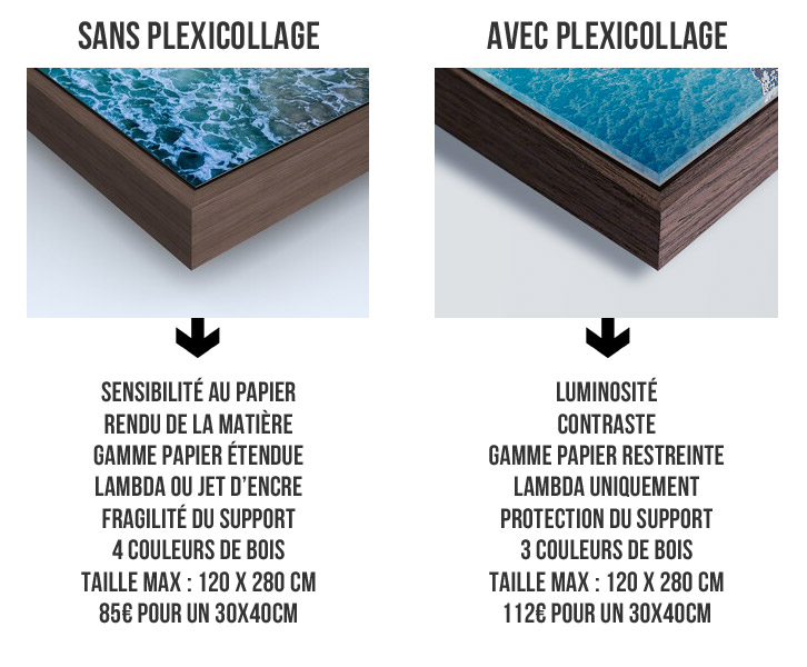 Ajouter un plexicollage à votre encadrement en caisse américaine, vous offrira un rendu très différent. En effet, votre tirage contrecollé sur une plaque d’aluminium sera placé sous une plaque de verre acrylique de 3 mm. Cette plaque, en plus de protéger la surface de tirage, donne du contraste et de la brillance à votre image. Offrant également une grande profondeur de rendu, la caisse américaine avec plexicollage illuminera vos photographies. Le choix du papier sera plus restreint que l’encadrement classique. En effet, le plexicollage a besoin de supports papiers spécifiques. Vous pourrez opter pour les papiers RC satinés ou brillants ou les papiers plus originaux que sont le Haute Réflexion (Fujiflex) ou le papier metallic. Le papier baryté est également disponible pour vos tirages noir et blanc.