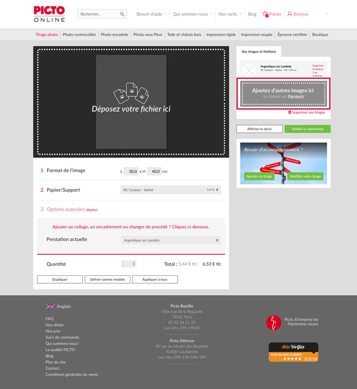 Si vous souhaitez tirer une photographie en plusieurs exemplaires, mais avec un format, un support ou une prestation différentes, utilisez le bouton “Dupliquer”, pour ne pas avoir à télécharger le même fichier une seconde fois. Il ne vous restera plus qu’à déterminer les spécificités de chaque duplicata.