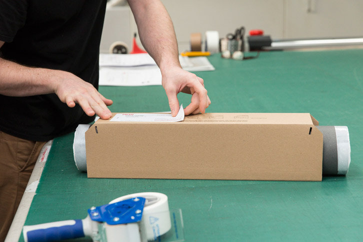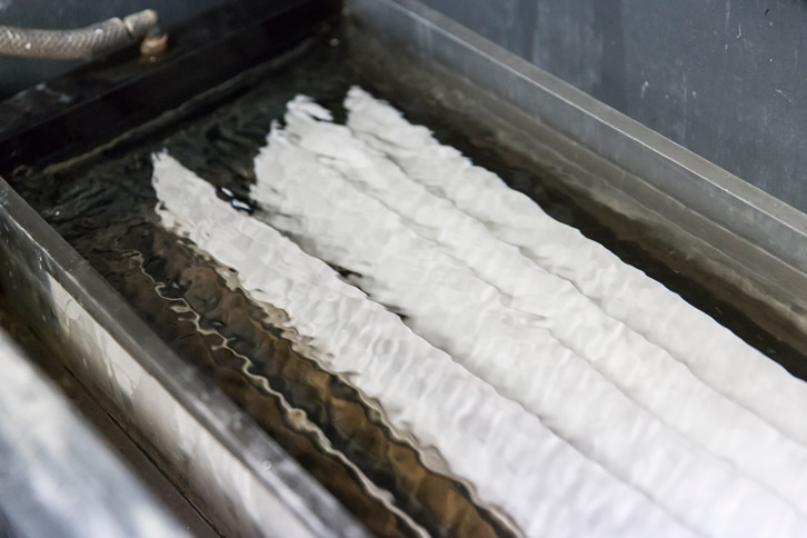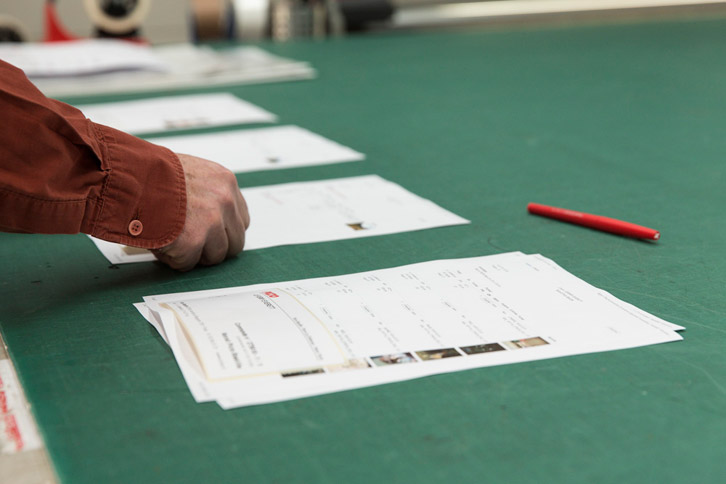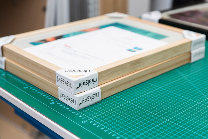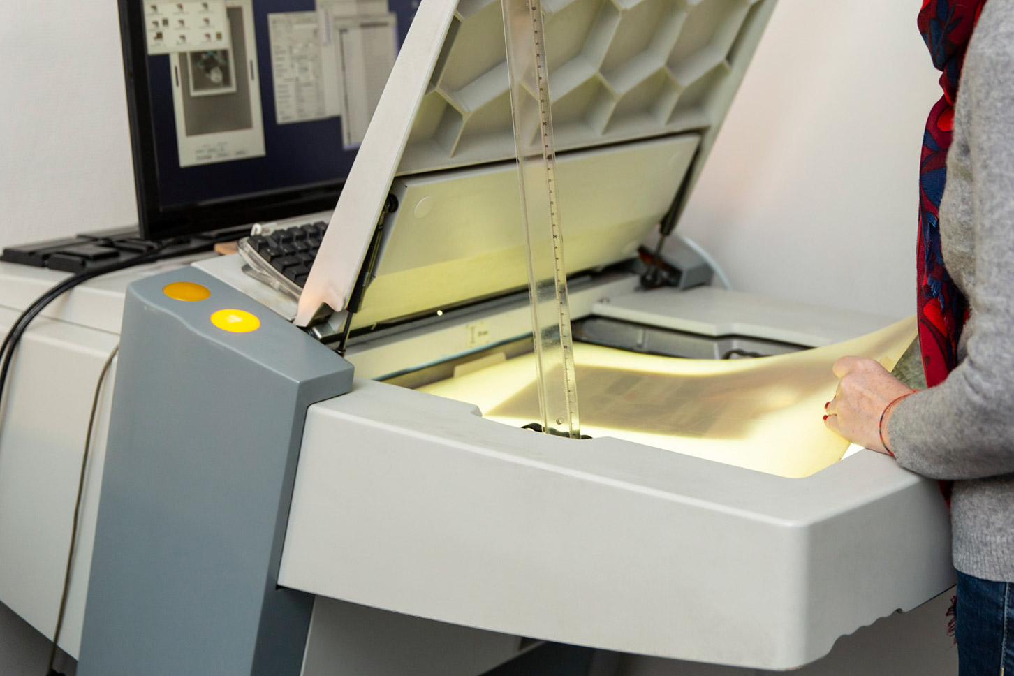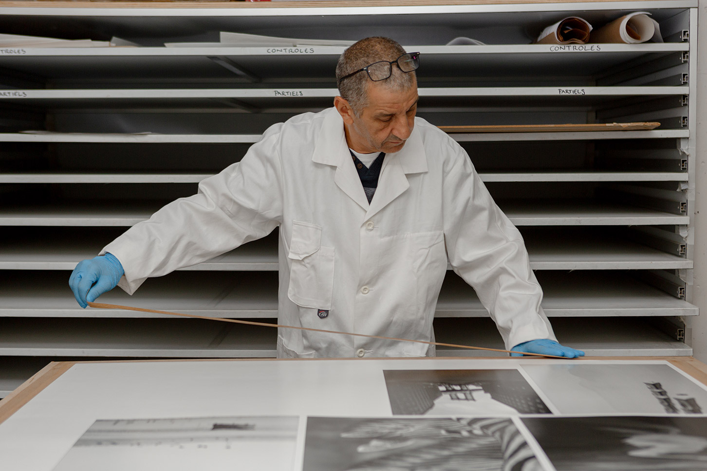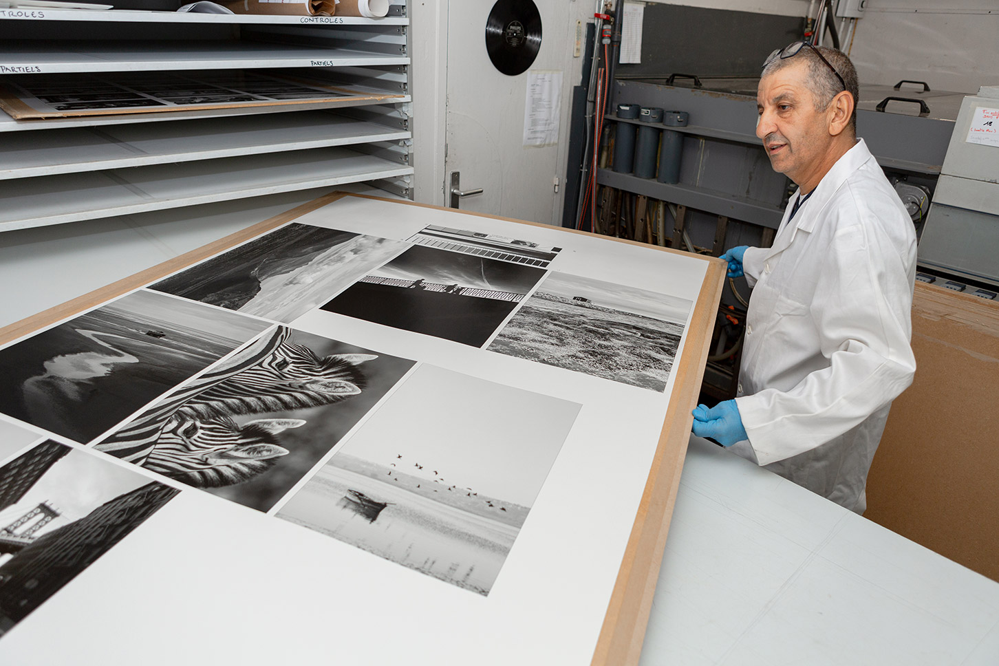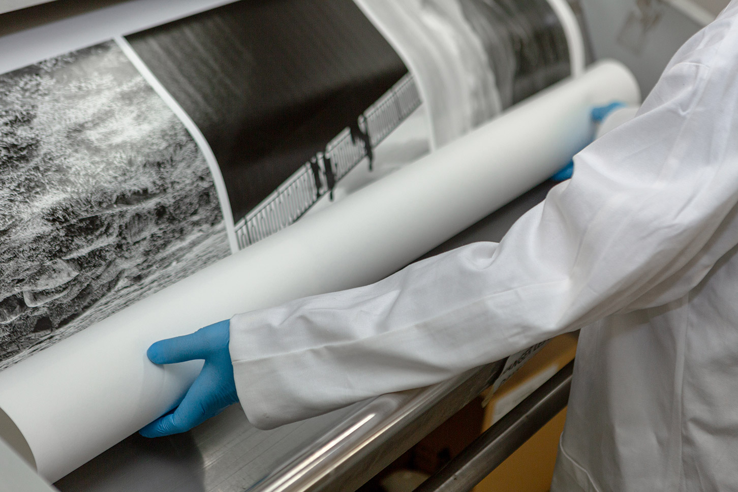Pour un tirage noir et blanc sur papier baryté, le procédé est plus complexe. La développeuse utilise une méthode traditionnelle, qui existe depuis plus d’un siècle, articulée en trois étapes : révélateur, fixateur, puis un lavage très soutenu, indispensable pour ce type de papier. Le séchage se fait ensuite de manière naturelle. À sa sortie de bain, le tirage, encore humide, est marouflé par un opérateur afin de limiter l’ondulation du papier. Il est tendu et maintenu sur ses bords à l’aide de papier gommé sur un support rigide. Lors du séchage, le papier baryté se rétracte, ce qui permet d’obtenir un tirage parfaitement plat. Selon la taille du tirage, un temps de séchage de 12 à 24 heures est nécessaire. Une fois sec, l’opérateur prépare le tirage pour la découpe.