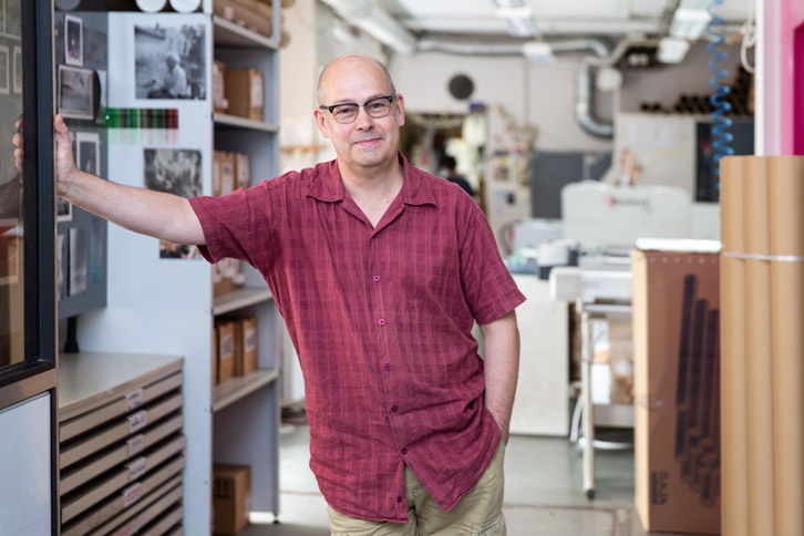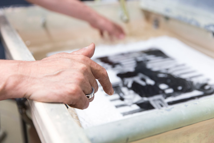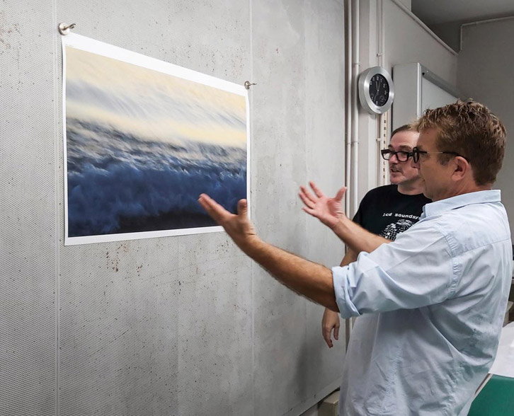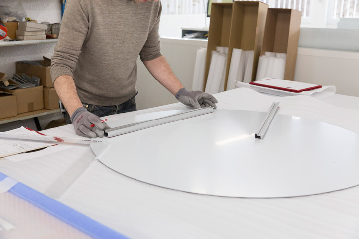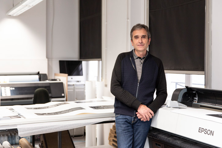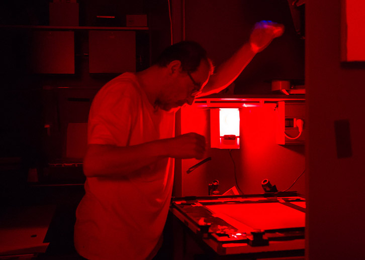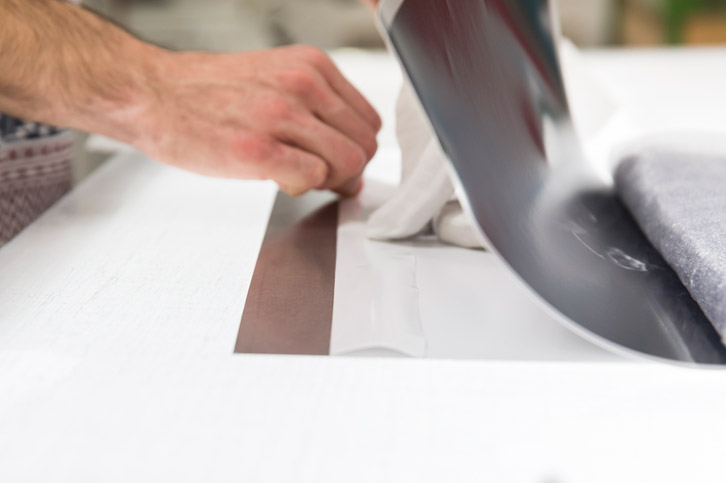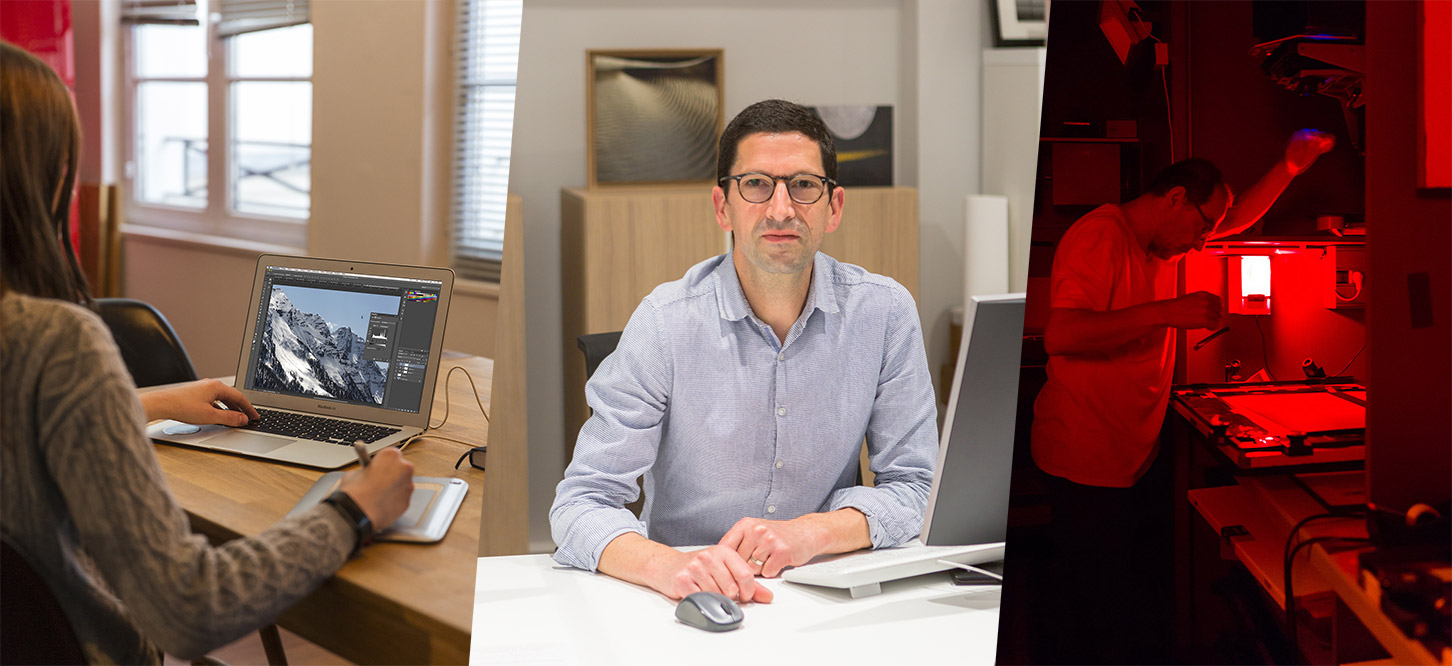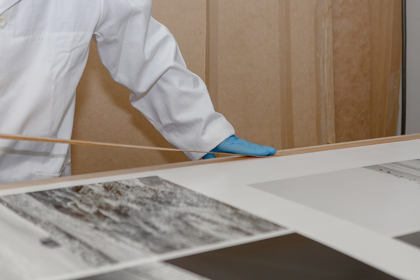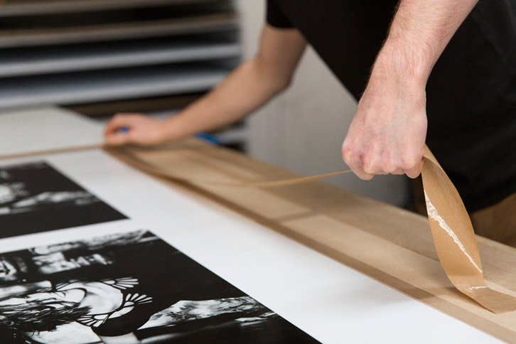 Opération de marouflage de tirages argentiques d’après fichier numérique sur papier baryté.