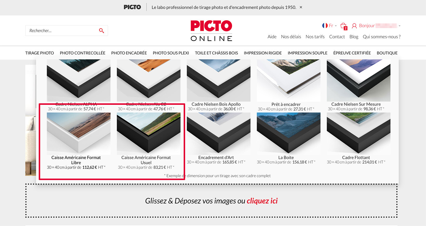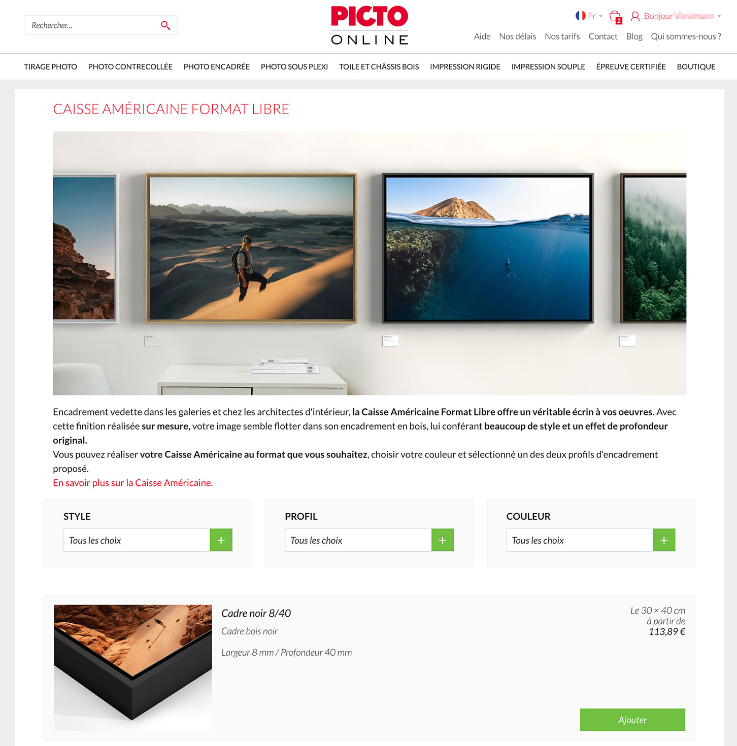 La plateforme Picto Online vous propose désormais d’ajouter une finition d’encadrement en caisse américaine pour vos impressions directes sur supports rigides. Vous pouvez associer les technologies d’impressions dernières générations avec le savoir-faire d’un véritable atelier d’encadrement, pour offrir un écrin de choix à vos images !