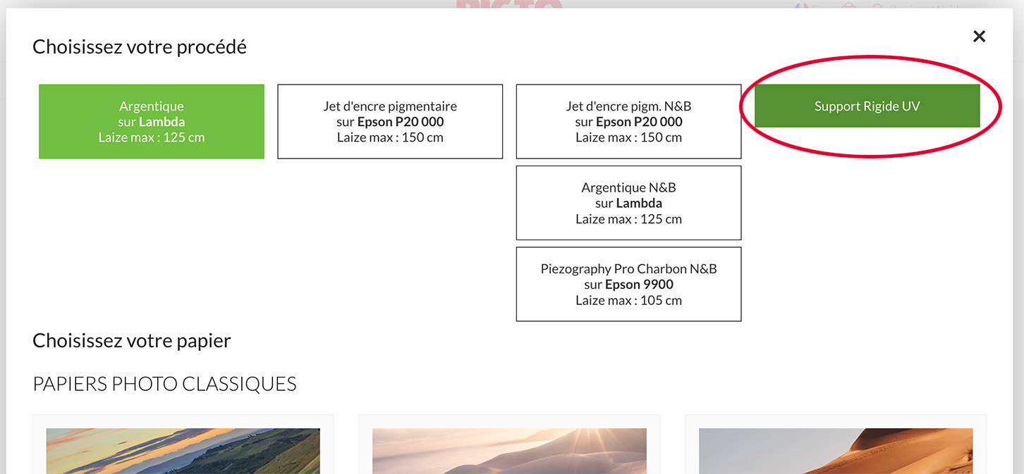 (3) - Par défaut, le support est le papier RC couleur en argento-numérique Lambda, il suffit de cliquer sur Papier/Support pour en sélectionner un autre procédé.