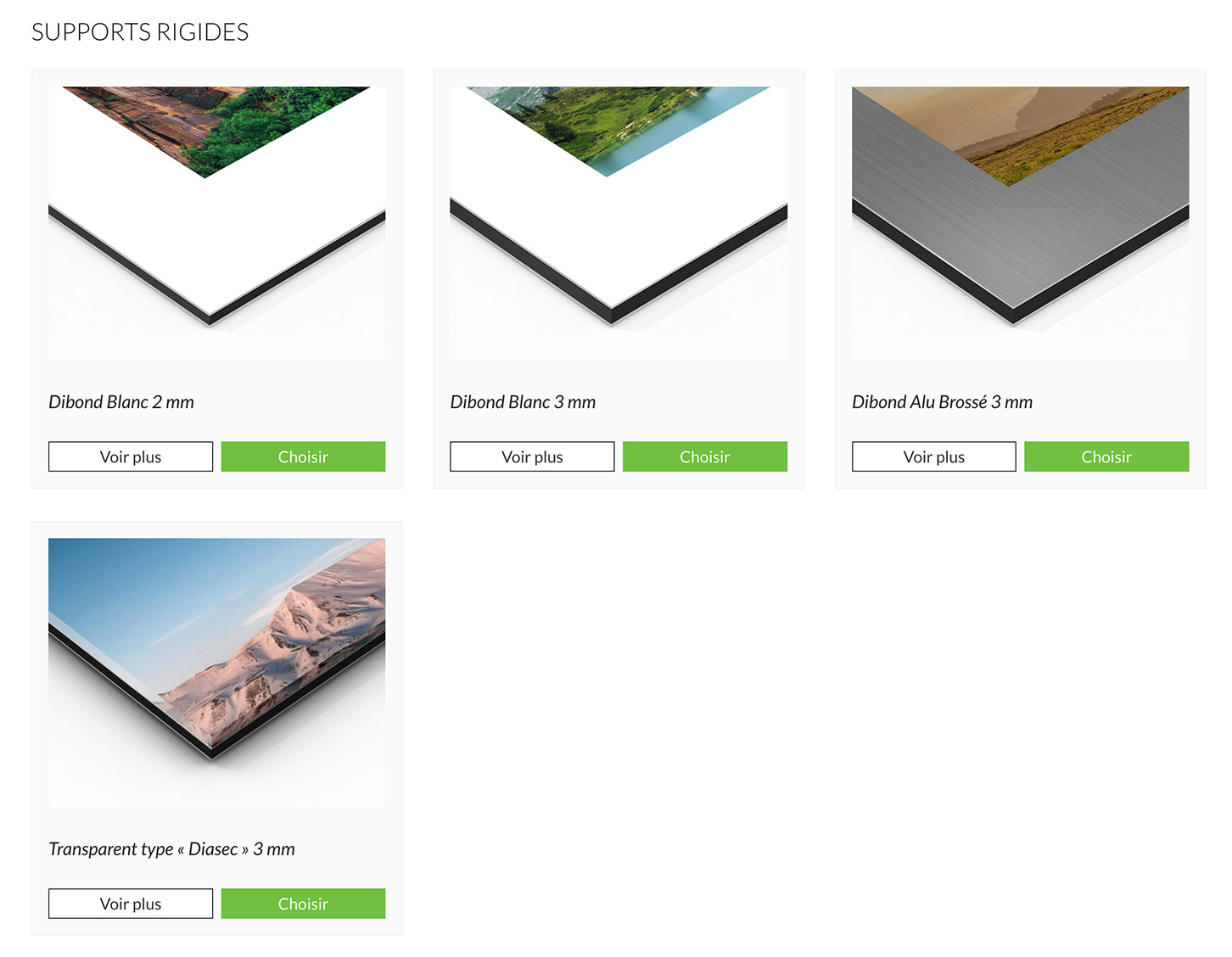 Supports Une vingtaine de supports papiers différents (Classique, Baryté, Fine Art,...) Dibond blanc 2 et 3 mm, Dibond Aluminium brossé 3mm, Plexi Transparent type Diasec 3mm