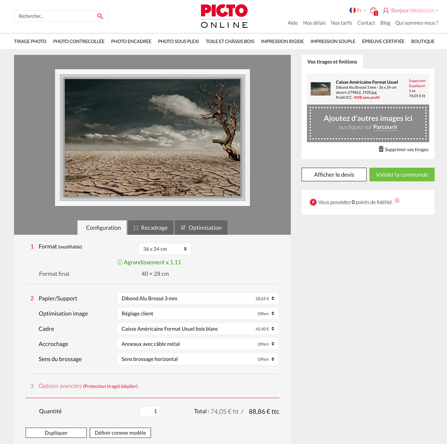 (6) - Vous pouvez ensuite modifier votre commande (taille d’impression, modifier le modèle de cadre, le choix d'accrochage et même le sens du brossage de l’Aluminium pour le Dibond Alu brossé). Puis vous pouvez valider la commande.