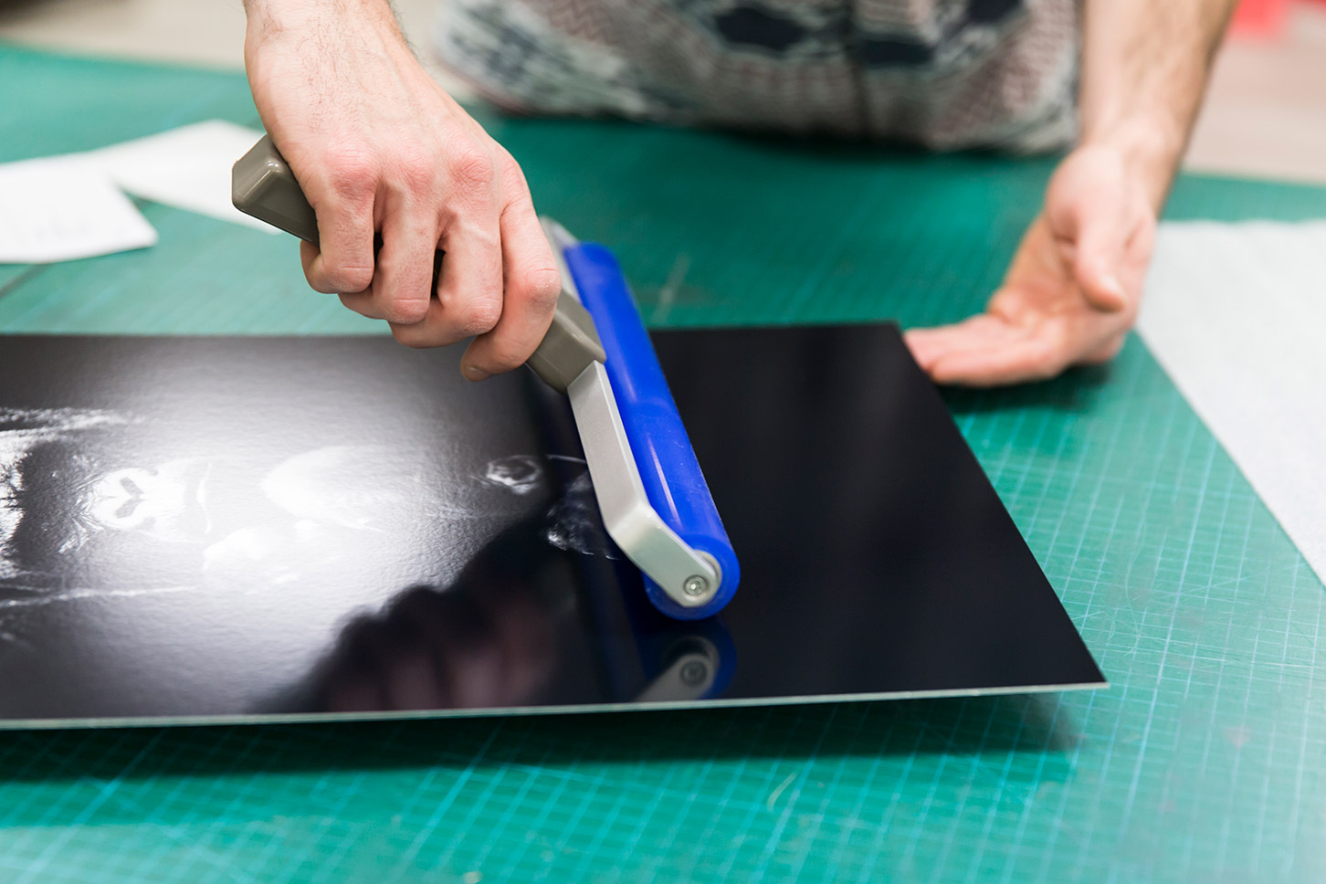 Le tirage est d’abord mis à plat, face imprimée orientée vers la table. Un rouleau antistatique est passé sur le dos du support afin de supprimer toutes les particules de poussières qui pourraient se trouver emprisonnées et créer ainsi un relief disgracieux. La surface de la plaque d’aluminium est nettoyée à l’aide d’un pistolet à air puis préadhésivée avec une colle spéciale neutre.
