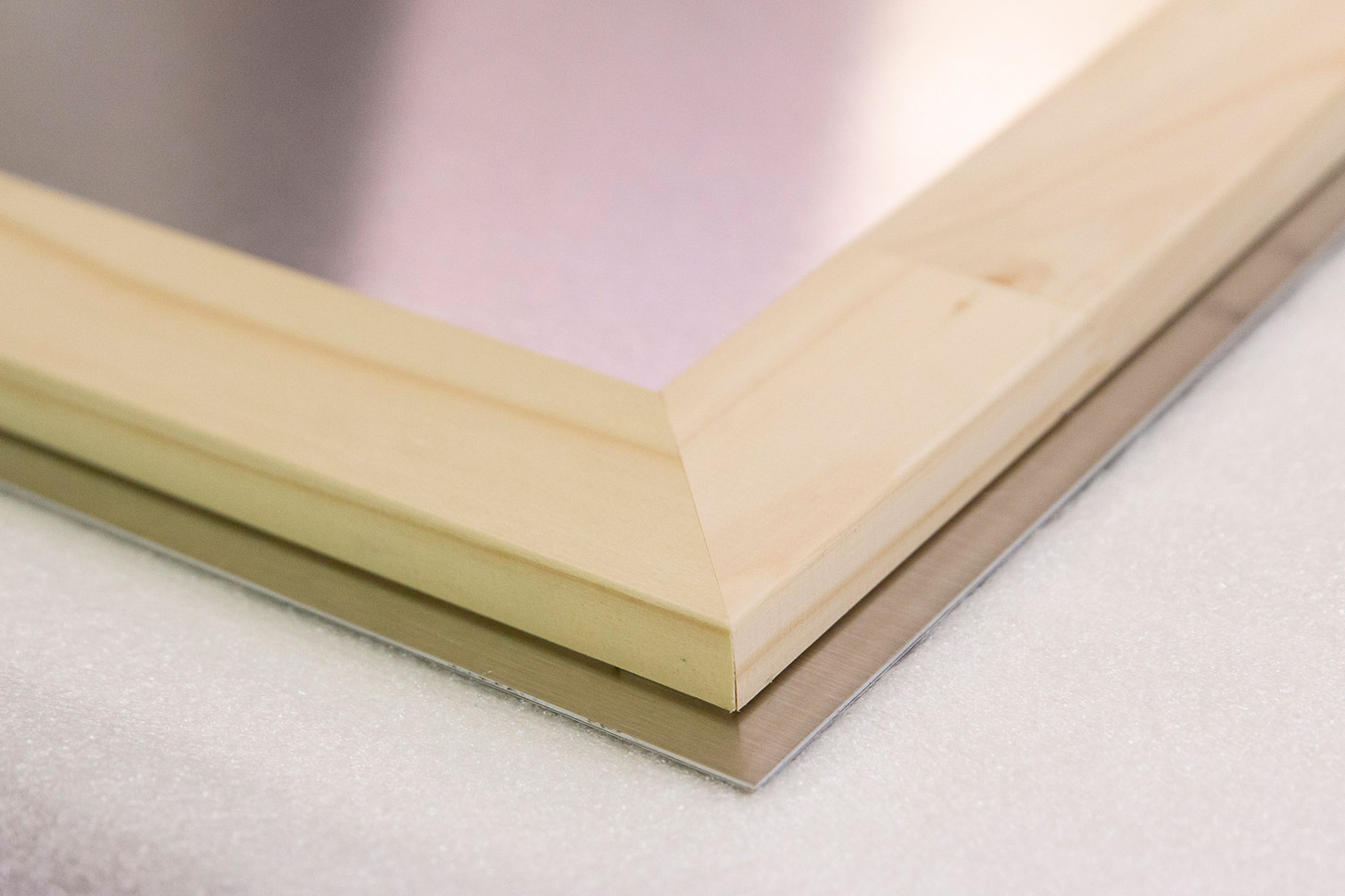 Le châssis est constitué de quatre baguettes en bois formant un cadre aux dimensions du tirage. Il a une double fonction : il rigidifie le contrecollage et décolle l’œuvre du fond du cadre.