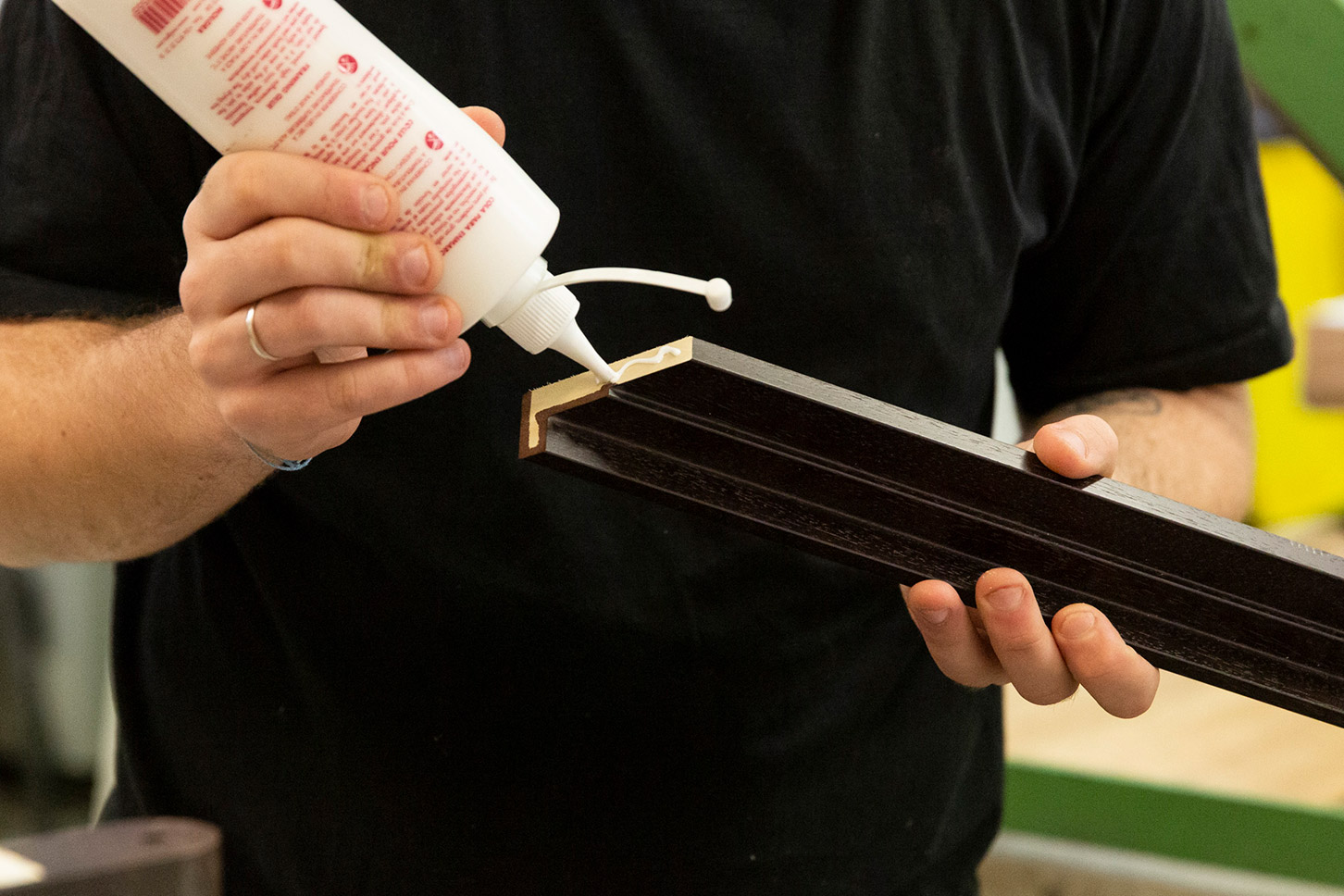 Les faces inférieures des baguettes sont préencollées avec un adhésif, puis fixées au dos de la plaque d’aluminium.