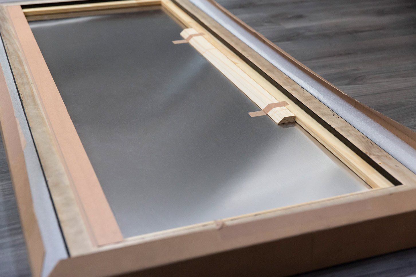 Le technicien cale la caisse en centrant le tirage par rapport aux baguettes. Il s’assure que l’espace compris entre les bords du tirage contrecollé et les baguettes composant le cadre est de 1 cm. Une fois le tirage calé, il visse la caisse sur le châssis. L'ensemble est emballé et des renforts sont ajoutés sur les côtés pour protéger la caisse lors de son transport.