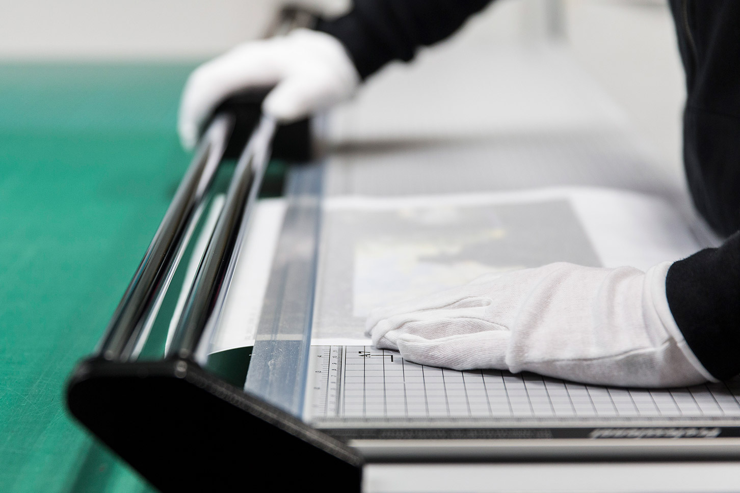 Une fois l’impression terminée, le rouleau de papier est coupé par un opérateur qui réalise une mise au format des tirages sur un massicot manuel, protégés sur leur face imprimée puis conditionnés à plat ou en rouleau, en fonction de la taille ou de votre demande. Une fois votre commande prête, elle vous sera livrée ou mise à disposition à l’accueil.