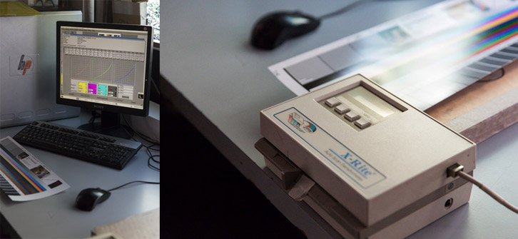 Pour obtenir des résultats de tirages les plus parfaits possibles, les imageurs Durst Lambda et Fuji Frontier sont suivis avec des gammes de linéarisation. Une gamme est réalisée chaque matin et à chaque nouveau papier ou nouvelle émulsion. Cette dernière est imprimée avec certaines valeurs de densité en Jaune, Magenta, Cyan qui sont lues avec un densitomètre. Si le test est bon, la production peut être lancée. Si ce n’est pas le cas, la machine va corriger les valeurs pour obtenir des courbes CMJ et des valeurs Dmax adéquats en fonction du support.
