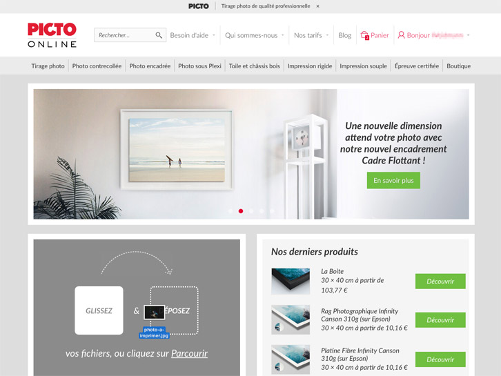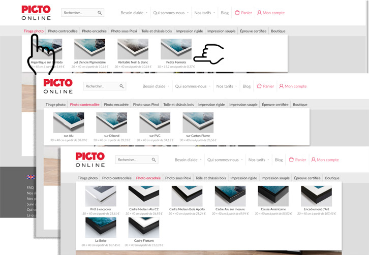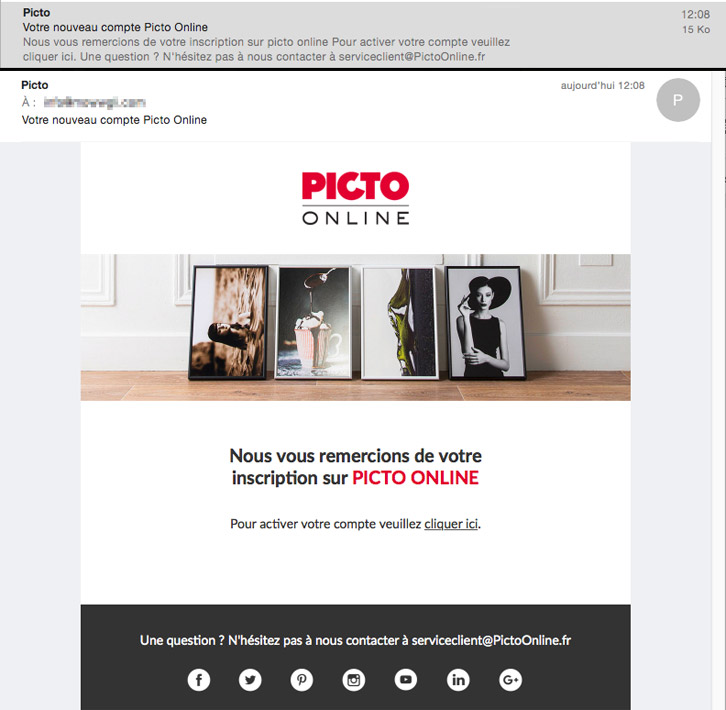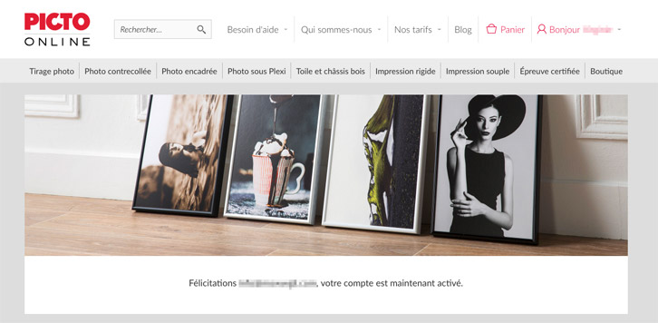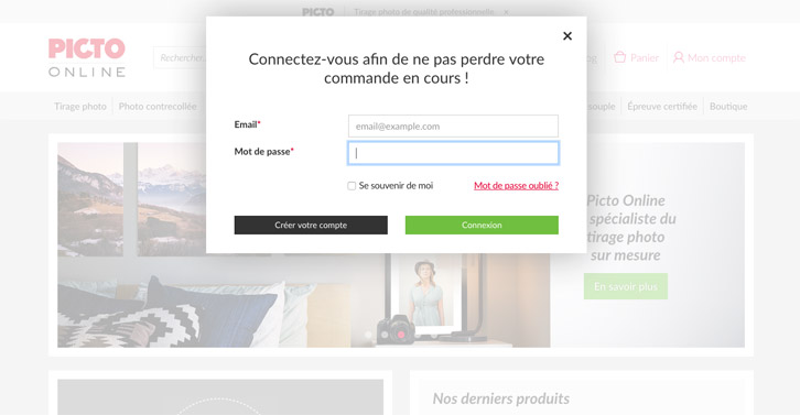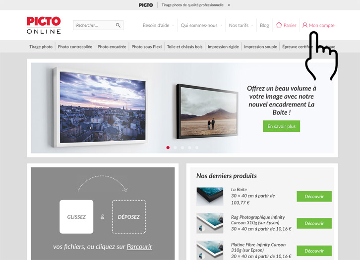 La première chose à faire avant de passer votre commande, c’est de créer votre compte PictoOnline. Pour cela, cliquez sur “Mon Compte” que vous retrouverez dans notre menu en haut à droite de l’écran. Vous accéderez à notre formulaire d’inscription dans lequel vous renseignerez toutes les informations nécessaires (certaines étant obligatoires et signalées par une “ * ”).