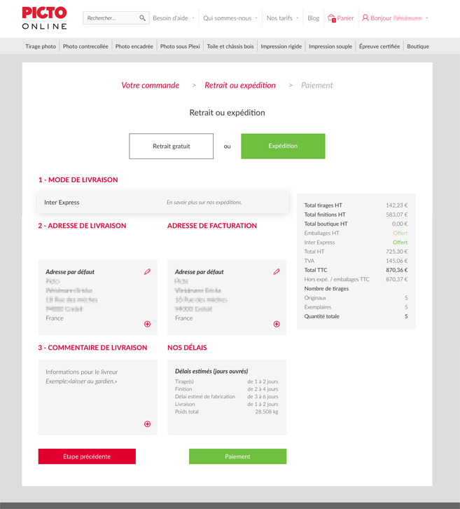 Lorsque vous commandez sur notre plateforme PictoOnline vous avez le choix entre le retrait gratuit dans nos différents points d’accueil (Bastille ou Gennevilliers) ou l’expédition. C’est sur cette page que vous ferez votre choix, avant de finaliser en cliquant sur le bouton vert “Paiement”.