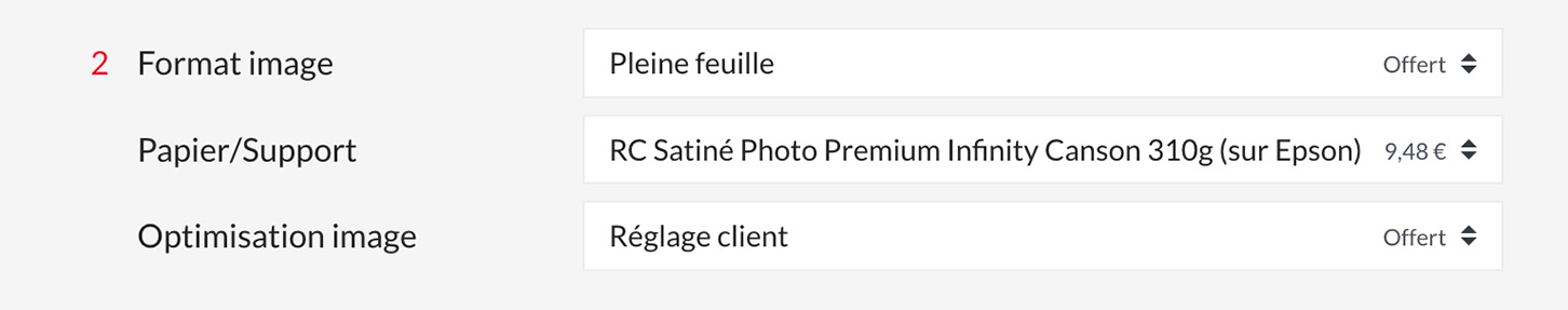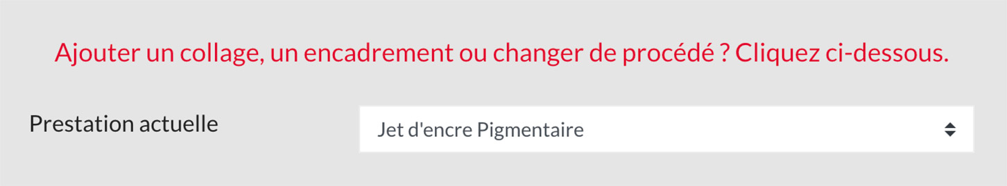Dans l’espace de paramétrage du tirage, la section « Prestation actuelle » vous permet de sélectionner le type de tirage que vous souhaitez. Cliquez sur le menu déroulant et sélectionnez votre procédé. Ici, nous allons choisir un tirage photo Argentique sur Lambda.