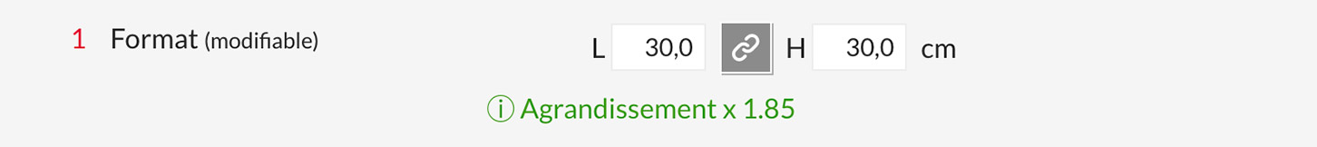 Si vous souhaitez effectuer un agrandissement, indiquez les valeurs souhaitées. Pour vous guider, un indicateur d'agrandissement vous indique grâce à un code couleur si votre fichier est adapté pour la taille demandée :