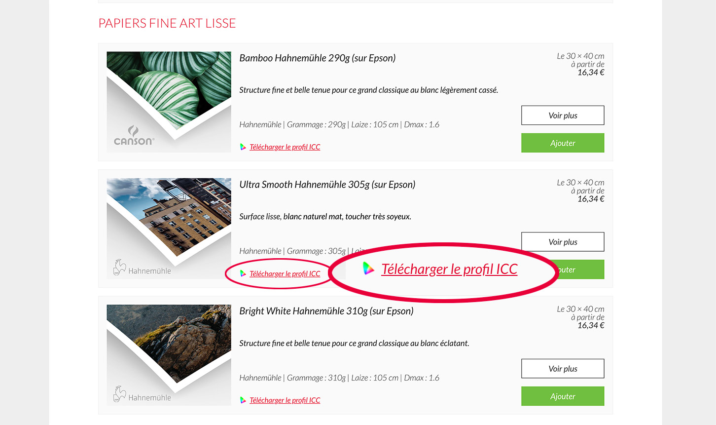 Au moment où vous choisissez votre support et votre procédé, vous retrouverez le profil ICC à télécharger pour l’affilier à vos fichiers sur le logiciel de traitement d’image de votre choix.