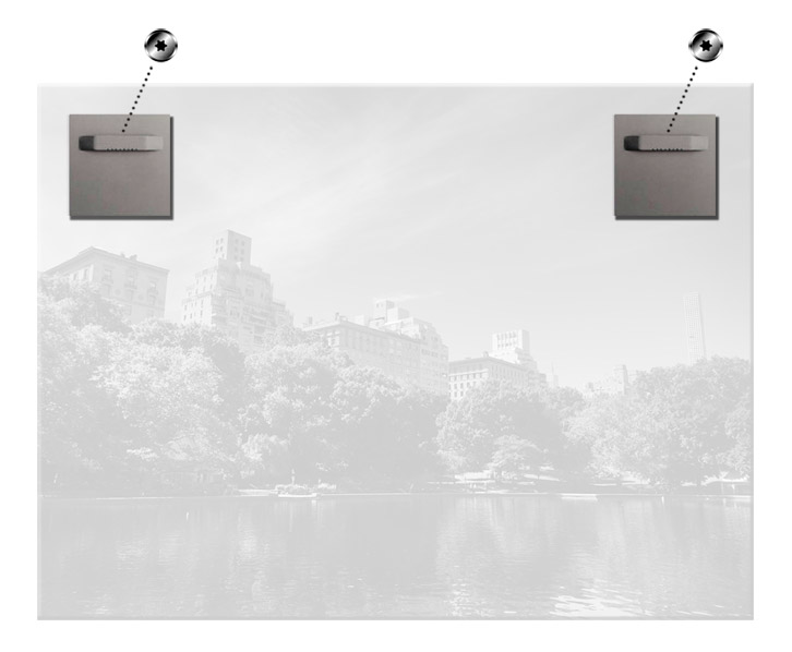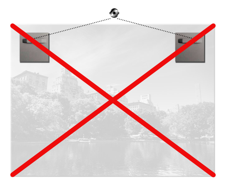 Attention, il est fortement déconseillé d’utiliser un pont filaire entre deux attaches. Ce mode d’accrochage doit être utilisé pour une suspension verticale. Avec le temps, les changements de température ou d’humidité, la suspension latérale contrainte par un pont filaire engendrerait une pression supplémentaire et le décollement probable d’une des deux attaches. Causant ainsi des dégâts sur votre tirage mais aussi sur son environnement (meuble, sol…).