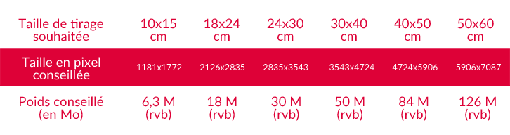 Excepté pour les impressions directes sur support rigide et souple, nous vous conseillons une résolution à 300 DPI pour vos fichiers, et retrouvez la taille conseillée en pixels.