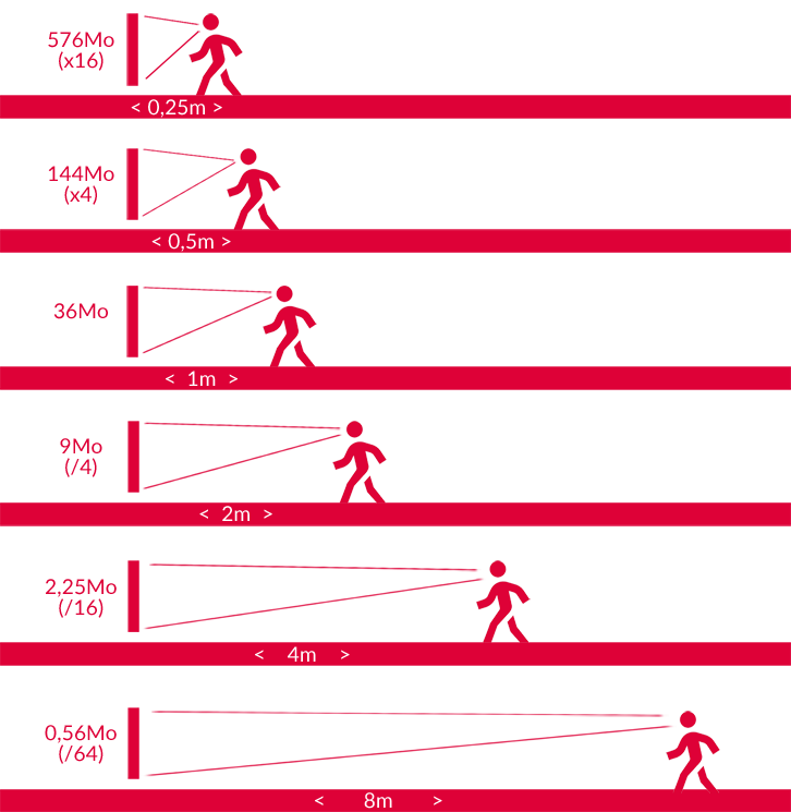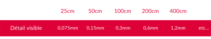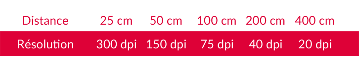 Les fameux 300 DPI, que l’on a l’habitude d’utiliser en photographie, ne sont pas forcément nécessaires pour toutes les images qui se trouveraient à plus de 25 centimètres de distance de la surface de notre rétine. Ainsi, on distinguera deux résolutions : la première, la ‘nominale’ pour les tirages de petites tailles qui sont à regarder de près, et la seconde, appelée ‘nécessaire et suffisante’ (ou ‘optimum’) pour observer de loin. Plus une image* nécessite du recul, plus sa résolution sera réduite. Elle sera divisée par deux à chaque fois que l’on double la distance de visualisation.