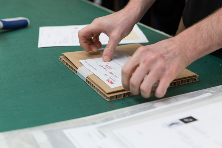 Emballage des petits tirages dans des enveloppes cartonnées renforcées par une plaque de carton alvéolaire afin d’empêcher le pliage