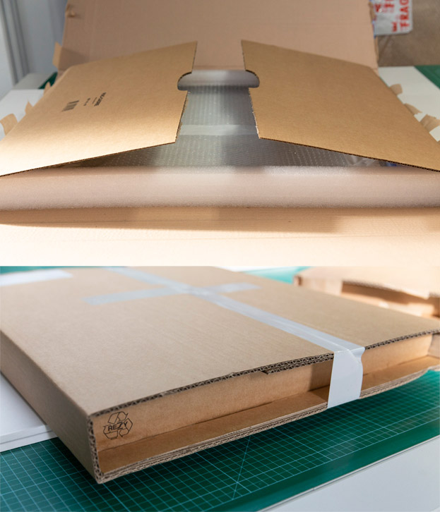 Les cartons d’emballage Raja pour l’envoi des cadres Nielsen / Le cadre sous bulle back scotché au carton de centrage placé dans le carton Raja
