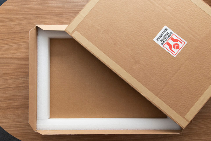 Pour vos commandes de tirages encadrés, ce sont des cartons d’emballage Raja à la côte des cadres Nielsen qui sont utilisés. Malgré l’utilisation du papier bulles entourant le cadre, il peut y avoir des cadres et/ou du verre abîmé. Pour palier à cela, tous les cadres, une fois emballés dans le bulle pack épais, sont fixés sur un carton de centrage découpé à la taille du pliage interne du carton d’expédition. En cas de chute, c’est ce carton qui absorbe les vibrations du choc, réduisant ainsi les possible détérioration du cadre et du verre.