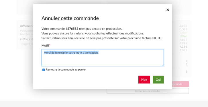 L’annulation complète d’une commande est possible et sans frais entre la validation et le paiement et sa mise en production !