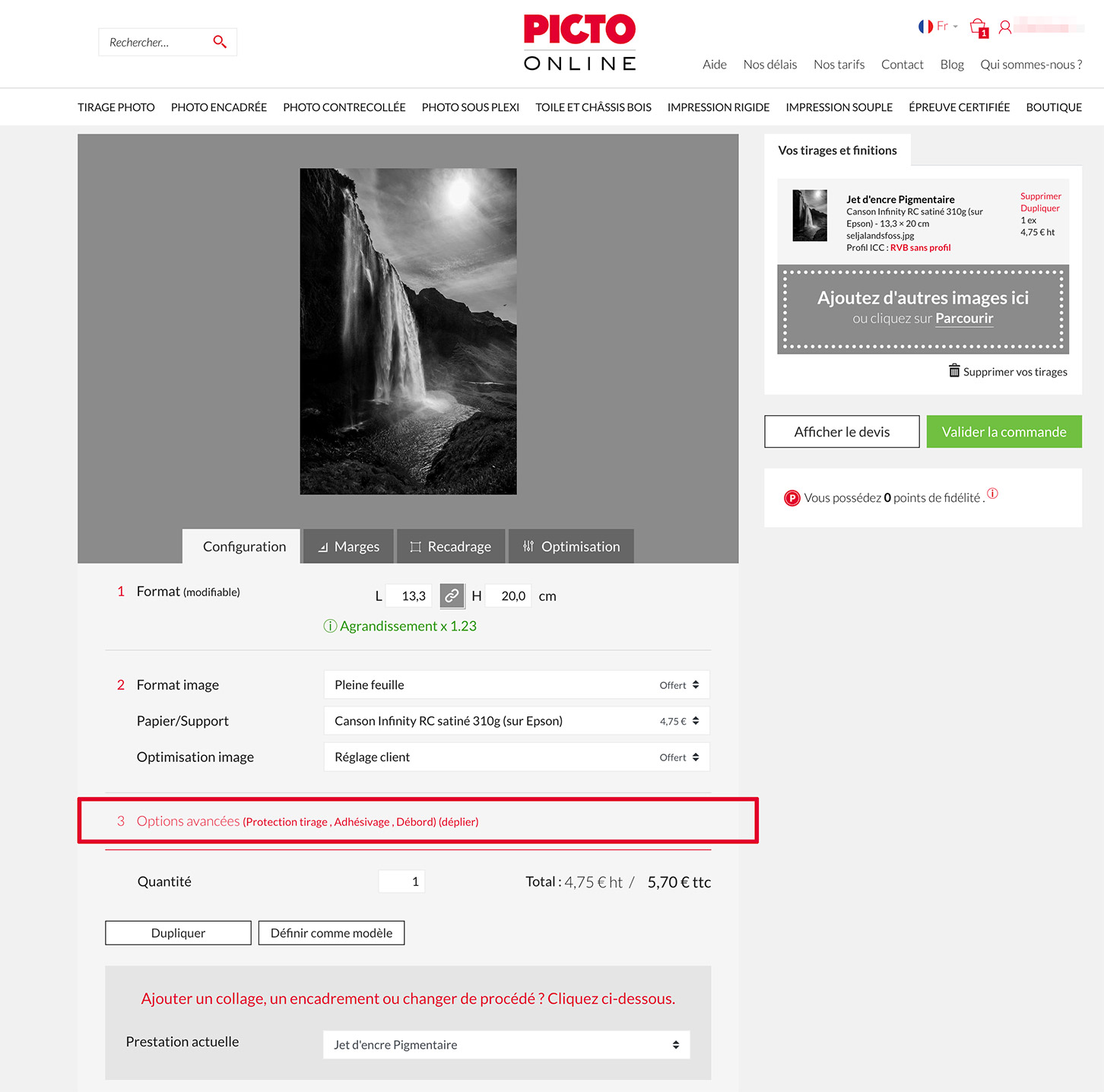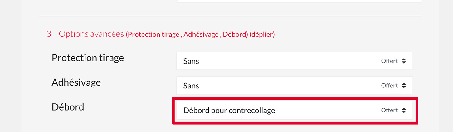 Lorsque vous chargez votre fichier et que vous avez choisi votre procédé et support vous pouvez sélectionner des options avancées en cliquant sur “3 Options avancées”.