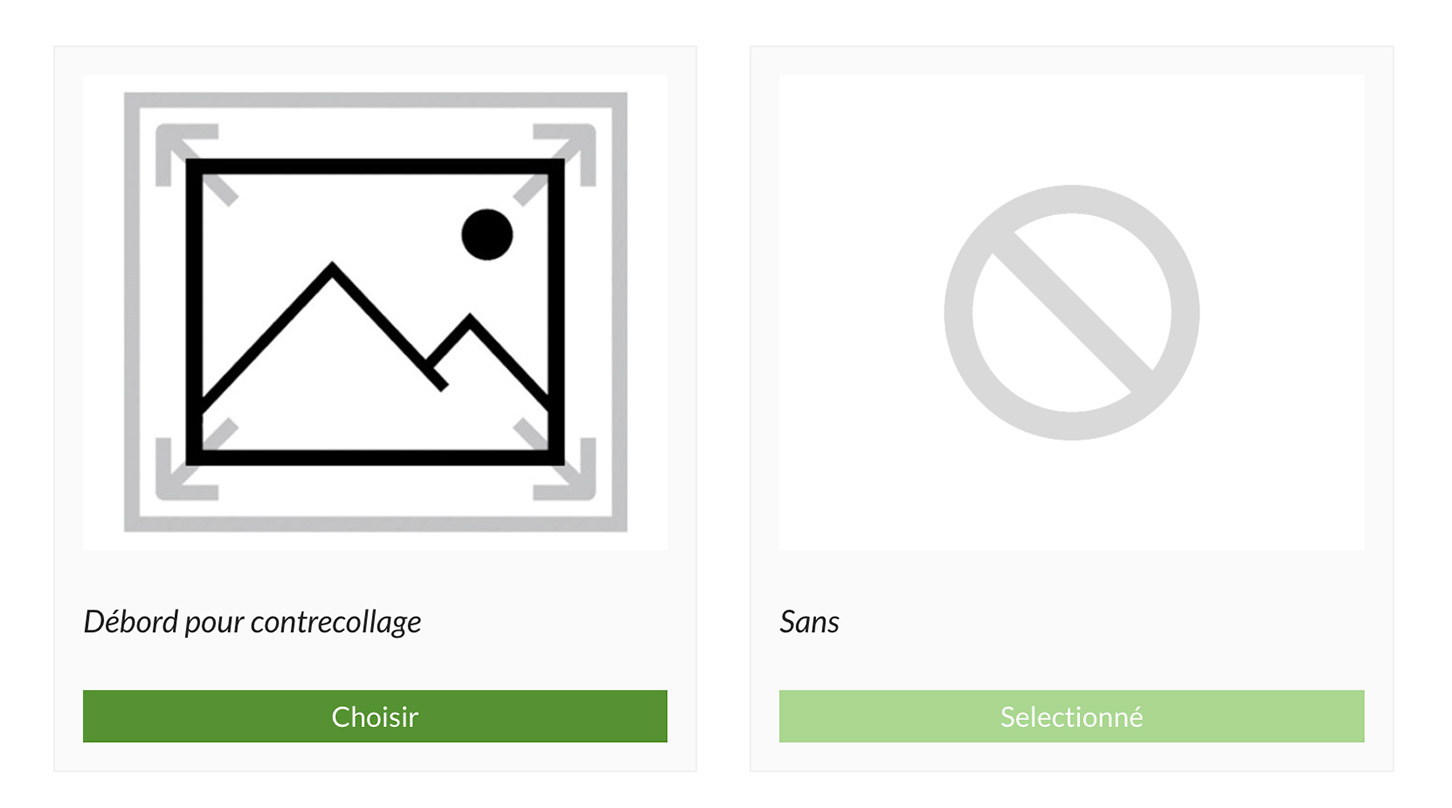 L’option « débord pour contrecollage » peut être sélectionnée dès l’importation de votre fichier sur notre plateforme.