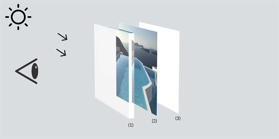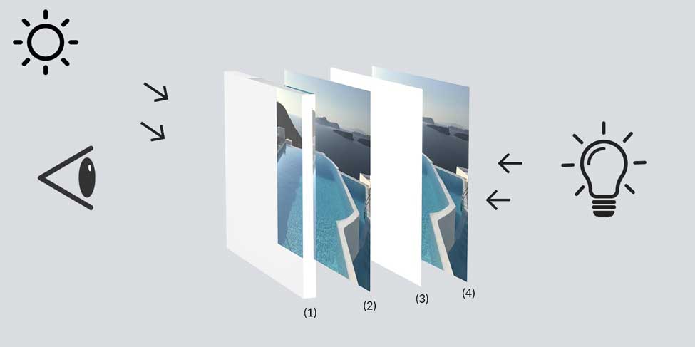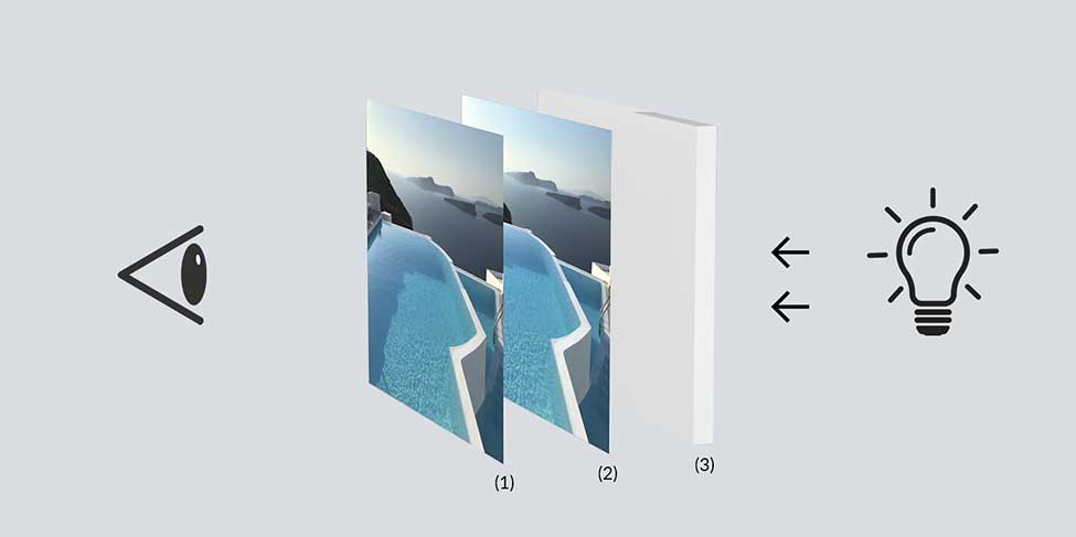 Printing under the acrylic glass plate and addition of white coating under the ink coating so as to provide a white ground.