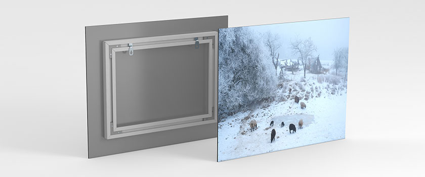 Au dos, vous pouvez opter pour un châssis rentrant, placé à 5 cm à l’intérieur, ou un châssis affleurant, courant le long de la plaque d’aluminium pour un effet « tableau ».