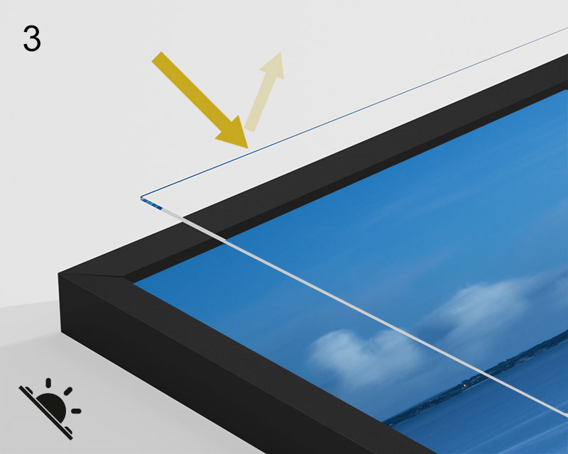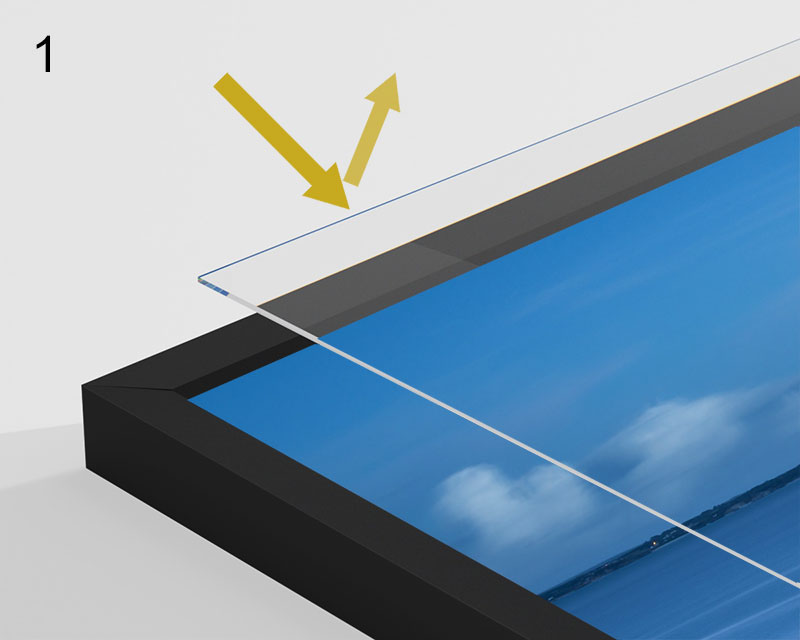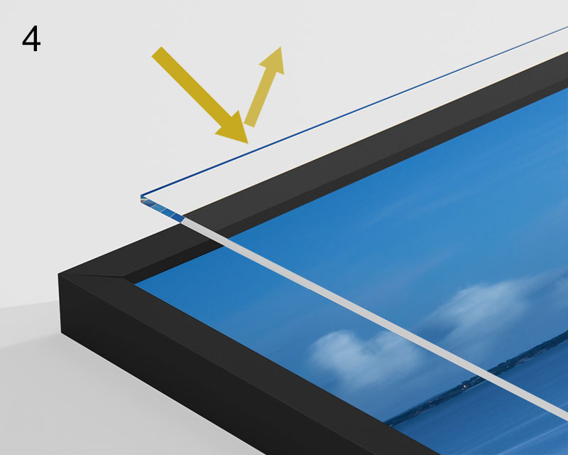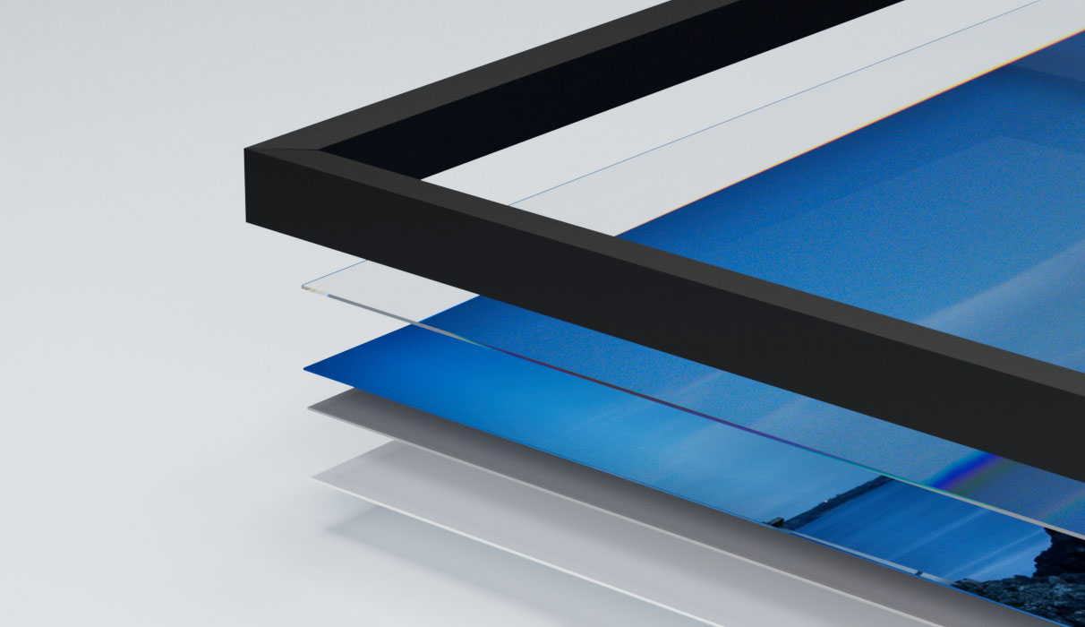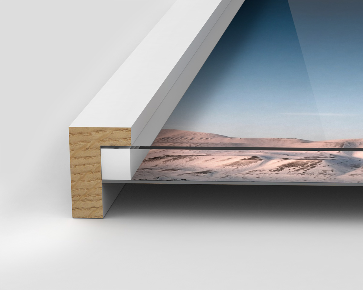 Avec un espace important (une rehausse) pour que le verre de protection soit en suspension au-dessus du tirage, votre image est mise en valeur tout en étant protégée.