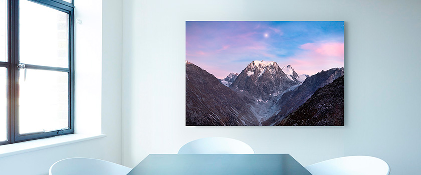 Exemple de configuration pour 30 × 40 cm : 121,00 € HT- Papier/Support : RC Brillant pour Pigmentaire spécial finition (sur Epson) - Accrochage : Châssis rentrant Aluminium 44 x 20 mm - Collage dos : Dibond 2mm pour Face Arrière Collage face : Plexi 3mm pour Face Avant.
